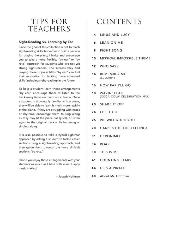 17 arrangements faciles de tubes pop avec des conseils d’instruction pour chacun par le célèbre instructeur YouTube M. Hoffman. Chaque chanson dispose également d’une piste démo et de pistes d’accompagnement en ligne pour aider les élèves à comprendre comment ils doivent sonner, puis jouer avec eux et paraître comme des pros ! Idéal pour les débutants en piano qui souhaitent utiliser leurs nouvelles compétences pour jouer de la musique populaire. Les chansons incluent : Can’t Stop the Feeling · Chanson de combat · C’est un pirate · Jusqu’où irai-je · Appuiez-vous sur moi · Laisse-le aller · Linus et Lucy · Secouez-le · C’est moi · Nous allons vous faire vibrer · et plus encore.