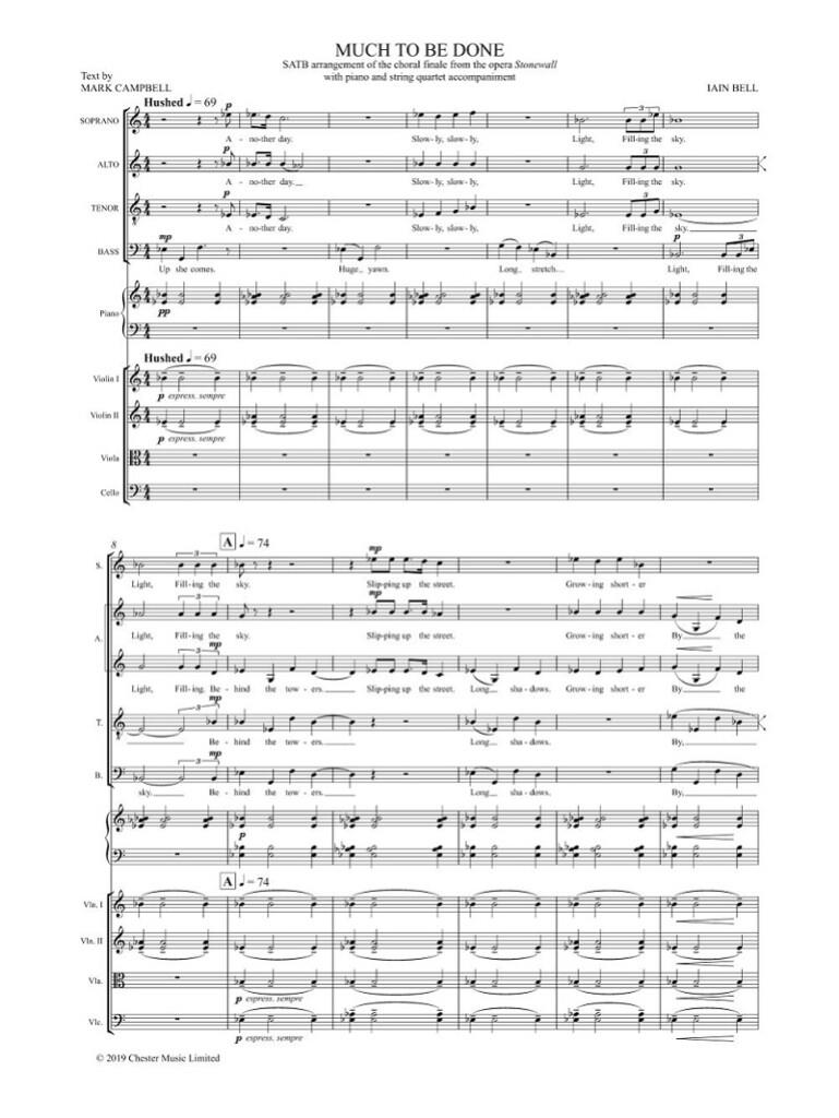 Un arrangement SATB du chœur final de l’opéra de Bell de 2019, « Stonewall », accompagné d’un piano et des cordes. « Much to be Done » a été commandé par The Pink Singers.