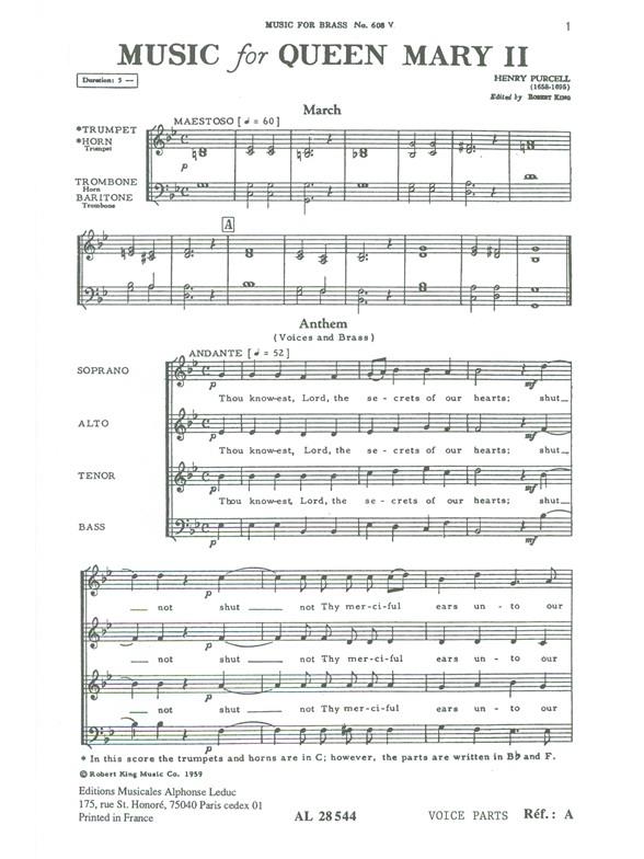 Purcell Music for Queen Mary 2 Brass Quartet & Choir Vocal Score