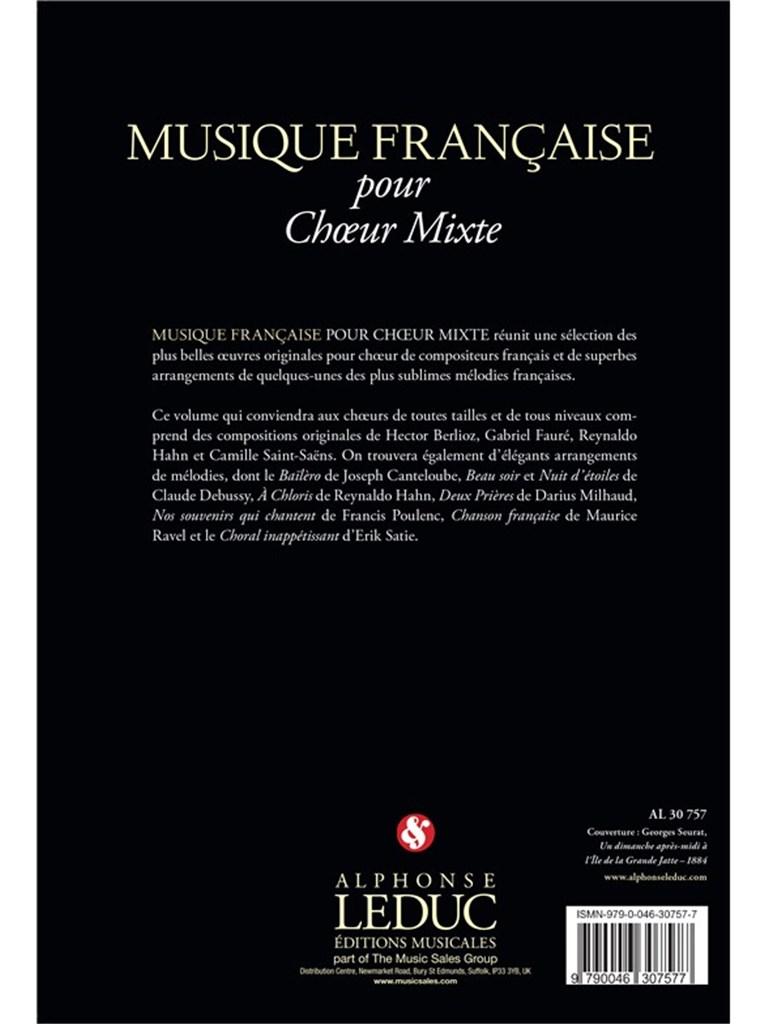 MUSIQUE FRANCAISE POUR CHOEUR MIXTE réunit une sélection des plus belles oeuvres originales pour choeur de compositeurs français et de superbes arrangements de quelques-unes des plus sublimes mélodies françaises.