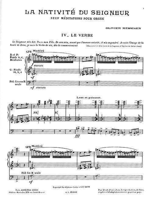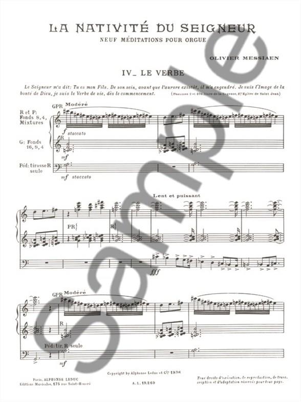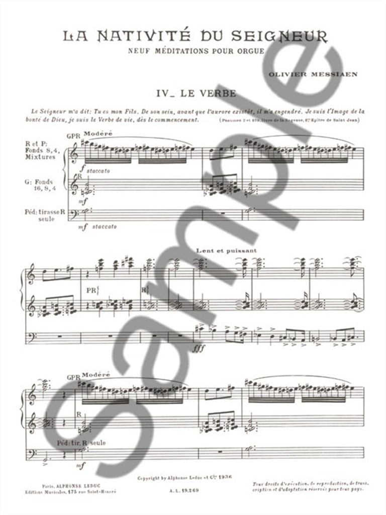 Written in four volumes, The Nativity of the Lord, by Olivier Messiaen was written in 1935 and depicts his Roman Catholic faith. Written for Organ, this piece is considered “one of the great Organ works of all time” and as a real masterpiece, as said by R. F. Goldman, the American composer. Divided into nine movements, each of which portrays a concept related to the birth of Jesus: 1. La vierge et l'enfant (The Virgin and Child) 2. Les bergers (The Shepherds) 3. Desseins éternels (Eternal designs) 4. Le verbe (The Word) 5. Les enfants de Dieu (The Children of God) 6. Les anges (The Angels) 7. Jésus accepte la souffrance (Jesus accepts suffering) 8. Les mages (The Magi) 9. Dieu parmi nous (God Among Us). This second volume features the meditations 4 and 5. La Nativité Du Seigneur is essential to all advanced organists seeking to expand and vary their repertoire. Olivier Messiaen (1908-1992) was a French organist and composer passionate about Ornithology and one of the most important composers of his century. Inspired by Japanese music, he had a very special way of composing and his work can be identified by its complexity, its diatonic aspect, its harmony with limited transposition, its colour and its additive rhythms. He composed many works related to ornithology and birdsong, including the 'Bird Catalogue' in 7 volumes and the 'Treatise on rhythm, colour and ornithology' in 7 volumes. Written in four volumes, La Nativite Du Seigneur, by Olivier Messiaen was written in 1935 and depicts his Roman Catholic faith. Written for Organ, this piece is considered ; one of the great Organ works of all time and as a real masterpiece, as said by R. F. Goldman, the American composer. Divided into nine movements, each of which portrays a concept related to the birth of Jesus: 1. La vierge et l'enfant (The Virgin and Child) 2. Les bergers (The Shepherds) 3. Desseins eternels (Eternal designs) 4. Le verbe (The Word) 5. Les enfants de Dieu (The Children of God) 6. Les anges (The Angels) 7. Jesus accepte la souffrance (Jesus accepts suffering) 8. Les mages (The Magi) 9. Dieu parmi nous (God Among Us) This second volume features the meditations 4 and 5. Olivier Messiaen (1908-1992) was a French organist and composer passionate about Ornithology and one of the most important composers of his century. Inspired by Japanese music, he had a very special way of composing and his work can be identified by its complexity, its diatonic aspect, its harmony with limited transposition, its colour and its additive rhythms. He composed many works related to ornithology and birdsong, including the 'Bird Catalogue' in 7 volumes and the 'Treatise on rhythm, colour and ornithology' in 7 volumes.