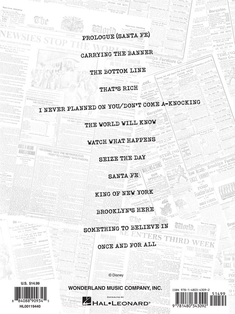 Arrangements au piano faciles de 13 morceaux de la célèbre comédie musicale de Broadway, basée sur le film Disney et inspirée par la véritable grève des Newsboys de 1899 à New York. Chansons : The Bottom Line - Brooklyn est là - Portant la bannière - Je n’ai jamais prévu sur toi / Ne frappe pas à la porte - Roi de New York - Une bonne fois pour toutes - Prologue (Santa Fe) - Santa Fe - Saisit l’Occasion - Quelque chose en quoi croire - C’est riche - Regarde ce qui se passe - Le monde saura.