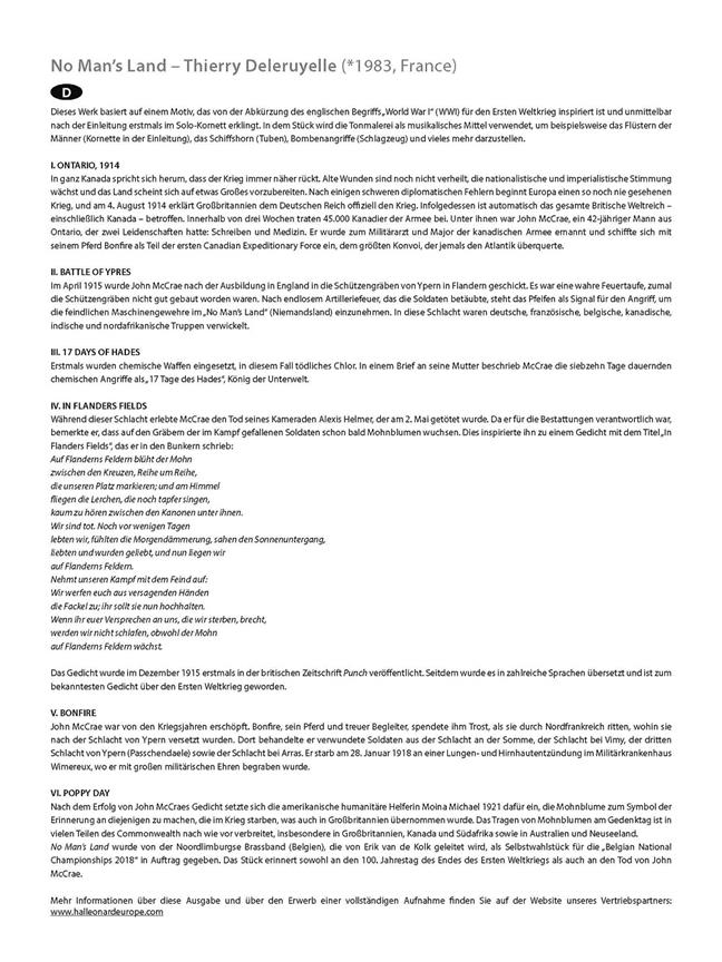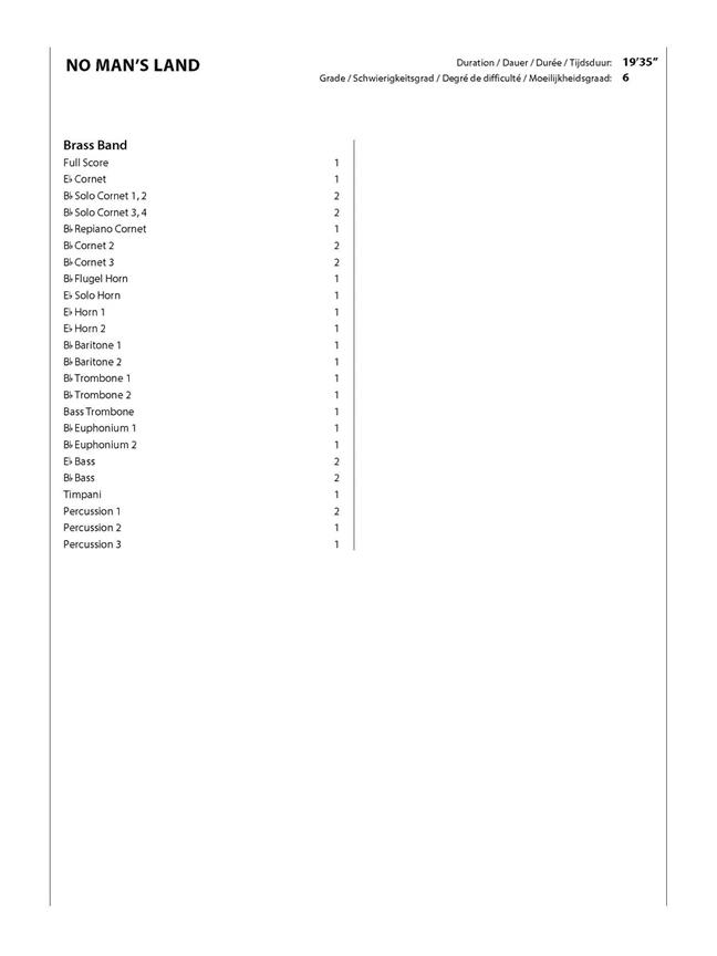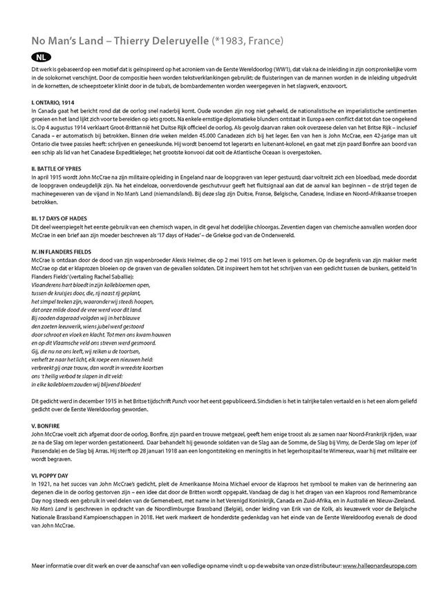 No Man’s Land est une commande du ‘Noordlimburgse Brass Band’. Thierry Deleruyelle a composé cette oeuvre en 2018, 100 ans après la fin de la Première Guerre Mondiale. Elle est liée à sa première composition pour brass band, Fraternity, qui retrace l’histoire de la Catastrophe de Courrières. Des pays tels que la Belgique et l’Allemagne ont apporté leur aide à la France. Huit ans après, la Première Guerre Mondiale a éclaté. Au lieu de s’aider les uns les autres, les zones de no man’s land sont survenues.’