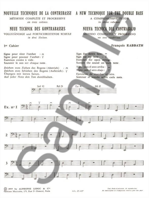 With little exisiting in the way of study books for the Double Bass, François Rabbath 's (b. 1931) three volume series, New Technique of the Double Bass is welcomed by all performers of the instrument. Syrian born Rabbath moved to Paris in 1955 to further his studies on the Double Bass. He soon began composing for the instrument as well as transcribing works of other composers for the instrument. The first volume of New Technique of the Double Bass is a significant contribution to the field of Double Bass pedagogy and covers physical approaches to the instrument, bowing, rhythms, intervals, while also containing exercises and studies. As a virtuoso player of the instrumenthimself, frequently performing as a soloist, Rabbath compiles this technical study book with vast knowledge and experience. Being such a prominent double bassist, Rabbath 's New Technique of the Double Bass, accompanied by a CD, is a well-informed and essential accompaniment to all Double Bass studies.