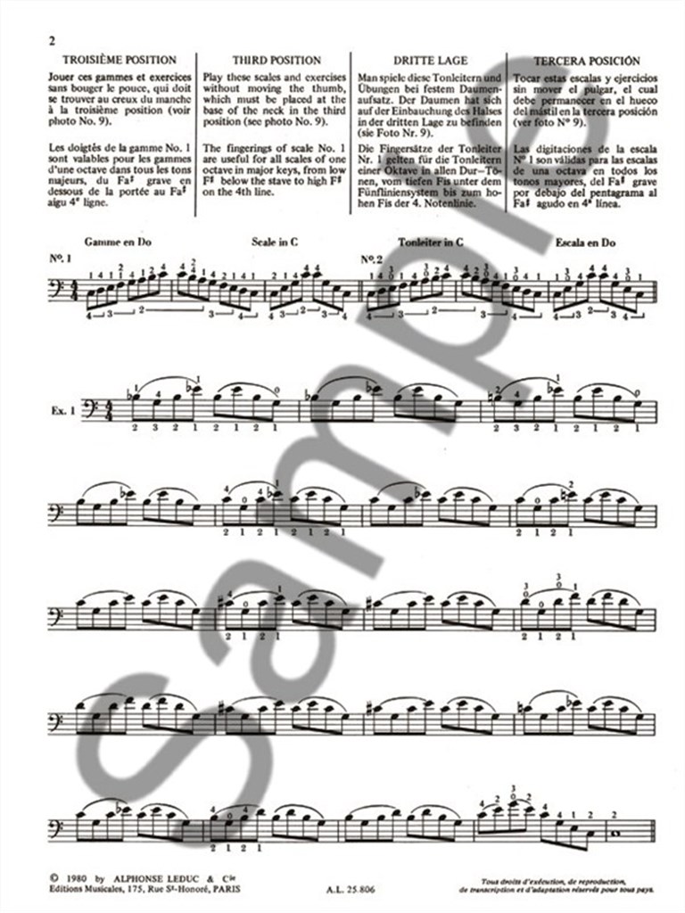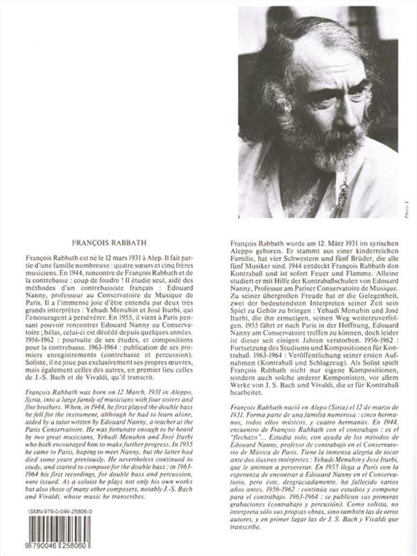 With little existing in the way of study books for the Double Bass, François Rabbath 's (b. 1931) three volume series, New Technique for the Double Bass is welcomed by all performers of the instrument. Syrian-born Rabbath moved to Paris in 1955 to further his studies on the Double Bass. He soon began composing for the instrument as well as transcribing works of other composers for the instrument. The second volume of New Technique for the Double Bass is a significant contribution to the field of Double Bass pedagogy and covers scales, arpeggios, bowing, among other aspects, and also containsexercises and studies. As a virtuoso player of the instrument himself, frequently performing as a soloist, Rabbath compiles this technical study book with vast knowledge and experience. Being such a prominent double bassist, Rabbath 's New Technique for the Double Bass is a well-informed and essential accompaniment to all all Double Bass studies. Moreover, New Technique for the Double Bass contains written instruction in English, French, German and Spanish, making for a highly versatile book.