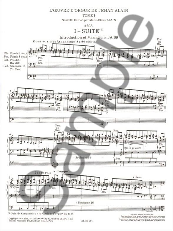 First of a series of three tomes by Jehan Alain, The Organ Work - Tome 1 is a set of two pieces in three parts each. For upper intermediate players and above, this first tome is quite difficult, with fairly fast movements that also feature the use of pedals. This first tome includes: I. Suite (Introduction et Variations JA 69, Scherzo JA 70 and Choral JA 82) II. Trois danses JA 120 (Joie, Deuils JA 120 bis and Luttes) The second tome consists of seven pieces while the third tome is the biggest with a total of fourteen. Jehan Alain is a French organist who became famous with his Suite for Organ. Student of Marcel Dupré and Roger Ducasse, among others, he kept composing all hislife. One of his most famous international pieces is 'Litanies'.