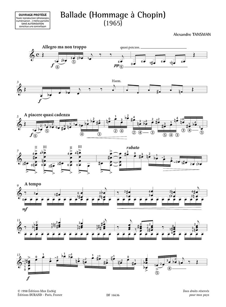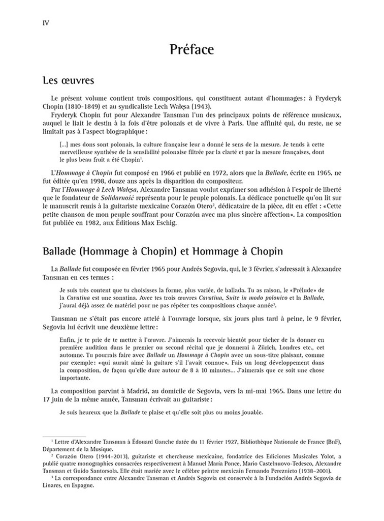Ce volume est le premier volet de l’édition critique des œuvres pour guitare d’Alexandre Tansman établie par Frédéric Zigante. Il contient les hommages musicaux rendus par le compositeur polonais deux grandes figures de l’histoire de son pays : le compositeur Fryderyk Chopin et le syndicaliste Lech Wa esa. Cette édition est basée sur la confrontation de tous les manuscrits disponibles et la reconstruction des sources puis des péripéties éditoriales de ces compositions, ce qui a permis de résoudre nombre de questions laissées ouvertes par les premières éditions.
