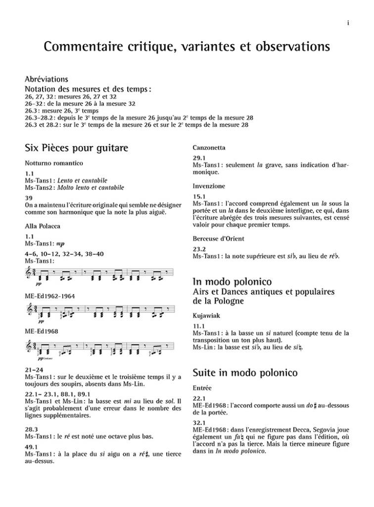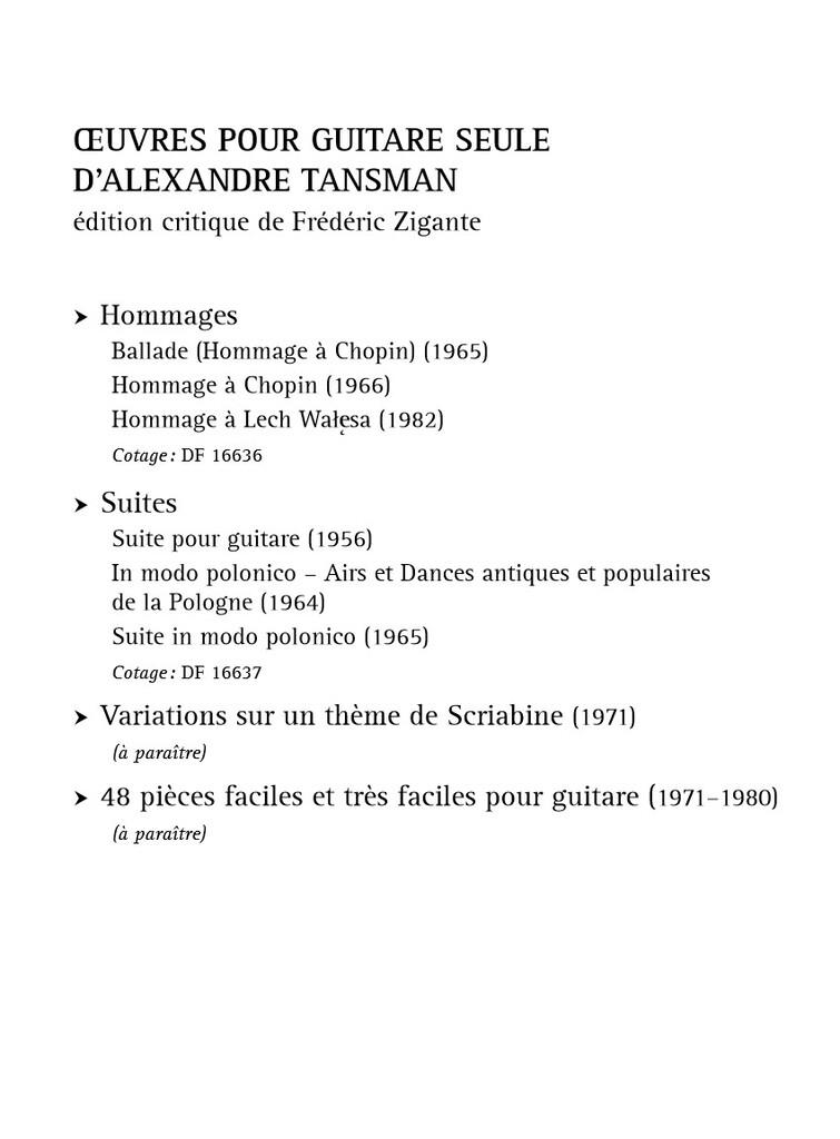 Œuvres pour guitare - Suites est le deuxième volume de l'édition critique des œuvres pour guitare d'Alexandre Tansman, sous la direction de Frédéric Zigante. L'édition rassemble trois compositions qui pourraient être attribuées au genre de la suite : Six Pièces pour guitare (1956), In modo polonico - Airs et Dances antiques et populaires de la Pologne (1964), et, Suite in modo polonico (1965). Ces pièces ont été envoyées à l'origine par Tansman à l'illustre Andrés Segovia, qui les a enregistrées et en a commandé d'autres. Tansman n'était pas guitariste et comptait sur le destinataire de ses pièces pour adapter sa musique à l'instrument. Segovia, quant à lui, n'a révisé que les pièces qu'il a incluses dans son répertoire de concert. De nombreuses pièces ont été laissées de côté par le compositeur lui-même ou, dans des cas plus rares, transmises à d'autres guitaristes. Basée sur une étude comparative des sources originales, cette édition répond à de nombreuses questions laissées en suspens dans les publications précédentes. De plus, cette édition publie enfin le Notturno romantico et la Cracovienne, laissés de côté par Tansman au cours du processus complexe de développement des suites. Les pièces proposées dans ce volume ne présentent pas de difficulté d'exécution particulière, car elles ont été adaptées aux particularités de l'instrument.