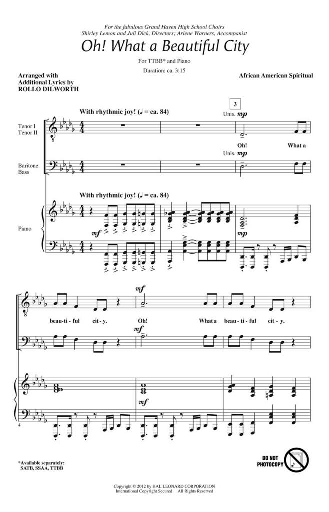 Évoquant les visions de Jean le Révélateur, ce spiritual afro-américain représente les douze portes de la ville qui représentent la liberté éternelle. Cet arrangement met en avant le matériel mélodique traditionnel et original avec des harmonies triadiques et un accompagnement percussif et rythmique, montant en intensité jusqu’au dernier Hallelu !