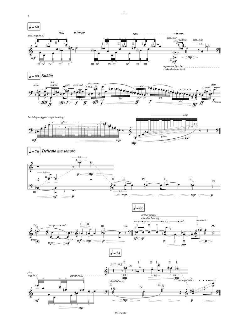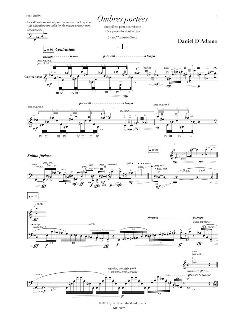 “Ombres portées” was commissioned by Radio France for the radio program Alla Breve. The piece is dedicated to Florentin Ginot. Performed without interruption, each of the five pieces of this cycle highlights certain characteristics and specific resources of the double bass, as are the natural harmonic sounds, the instrumental spectrum, the bowing techniques or those of the left hand, the possibility of sliding every sound, the natural inertia and speed of the instrument, its heaviness and its lightness, etc. “Ombres portées” was first performed by Florentin Ginot on February 29, 2017, as part of the Présences/Radio France Festival.