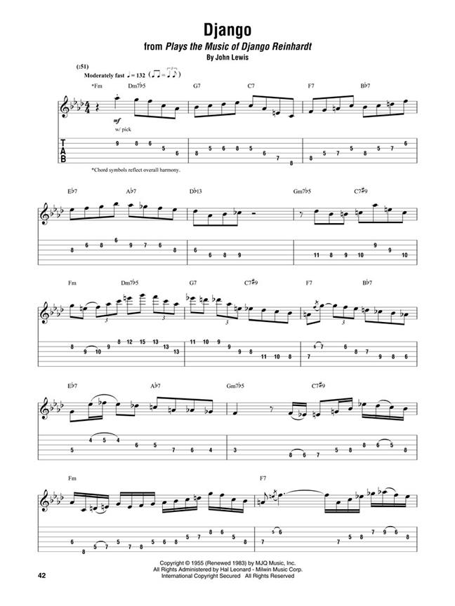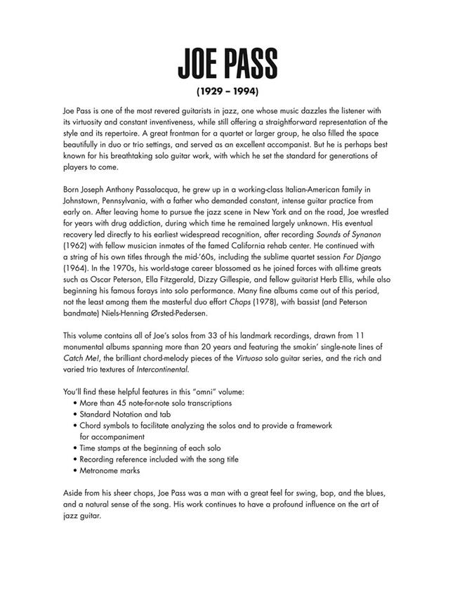 33 of his recorded solos transcribed exactly for C instruments. Includes standard notation and a separate staff with guitar tab. Including: All the Things You Are - But Not for Me - Cavalerie - C.E.D. - Chlo-e - Django - 500 Miles High - For Django - Giant Steps - Have You Met Miss Jones? - I Love You - In a Mellow Tone - Just Friends - Limehouse Blues - Love for Sale - Love Is Here to Stay - Meditation (Meditacao) - Night and Day - The Night Has a Thousand Eyes - Oleo - Robbins Nest - Rosetta - Satin Doll - Soon - Speak Low - Stella by Starlight - Stompin at the Savoy - Tricrotism - Watch What Happens - Windows - Yardbird Suite - You Stepped Out of a Dream.