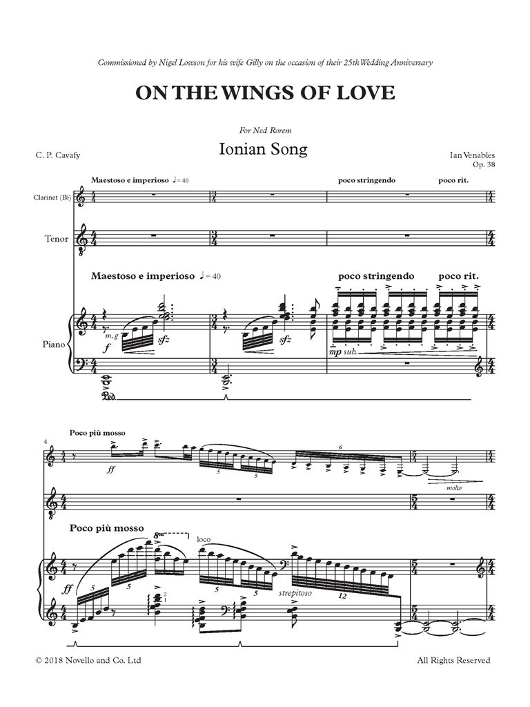 Six songs for Tenor, Clarinet and Piano, this set takes its name from Plato's Symposium setting texts by Constantine P. Cavafy, Federico Garcia Lorca, Jean de Sponde, Emperor Hadrian, Jim Denning and William Butler Yeats. Six songs for Tenor, Clarinet and Piano, this set takes its name from Plato's Symposium setting texts by Constantine P. Cavafy, Federico Garcia Lorca, Jean de Sponde, Emperor Hadrian, Jim Denning and William Butler Yeats.