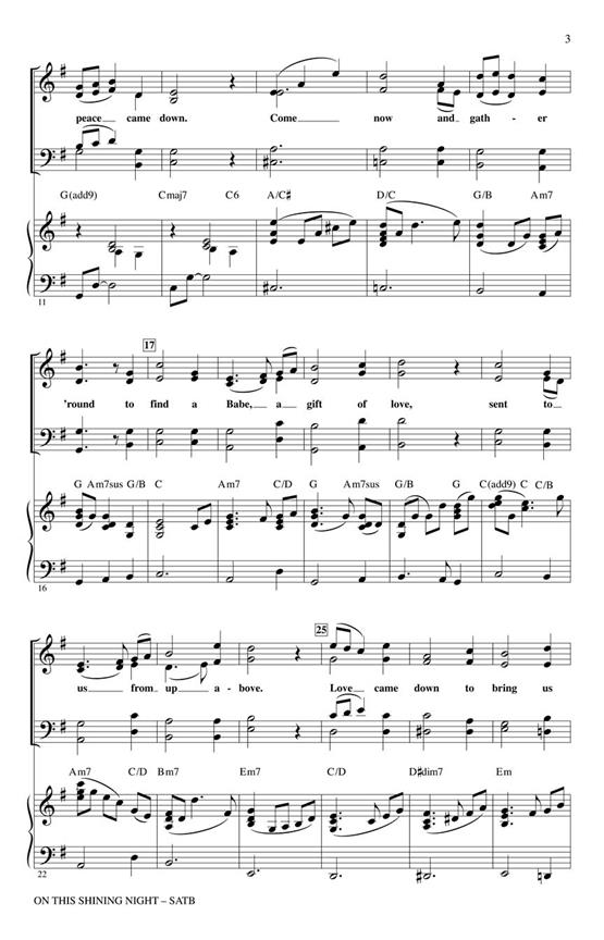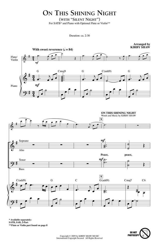 Créez un moment de douce réflexion lors de votre concert avec ce charmant duo de la favorite de Noël Silent Night à une tendre mélodie originale. L’amour est descendu pour nous apporter la lumière en cette nuit éclatante. Avec flûte, violon ou autre instrument mélodique. Disponible séparément : SATB, SAB, 2 parties. Durée : environ 2:30.