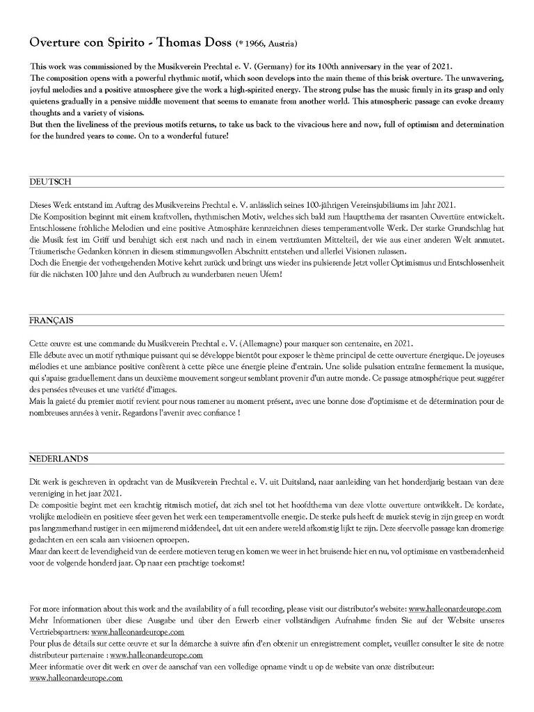 Cette œuvre est une commande du Musikverein Prechtal e. V. (Allemagne) pour marquer son centenaire, en 2021. Elle débute avec un motif rythmique puissant qui se développe bientôt pour exposer le thème principal de cette ouverture énergique. De joyeuses mélodies et une ambiance positive confèrent à cette pièce une énergie pleine d’entrain. Une solide pulsation entraîne fermement la musique, qui s’apaise graduellement dans un deuxième mouvement songeur semblant provenir d’un autre monde. Ce passage atmosphérique peut suggérer des pensées rêveuses et une variété d’images. Mais la gaieté du premier motif revient pour nous ramener au moment présent, avec une bonne dose d’optimisme et de détermination pour de nombreuses années à venir. Regardons l’avenir avec confiance !
