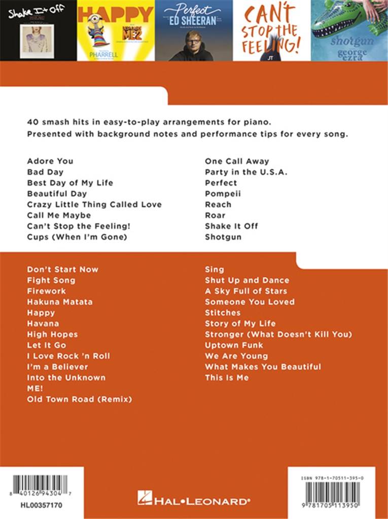 40 chansons célèbres auprès des enfants et des adolescents dans des arrangements faciles pour piano, présentés avec des commentaires de fond et des conseils d'interprétation pour chaque chanson. Comprend : Adore You - Best Day of My Life - Can't Stop the Feeling ! - Cups (When I'm Gone) - Fight Song - Happy - I'm a Believer - Let It Go - Old Town Road (Remix) - Roar - Stitches - This Is Me - et bien d'autres.