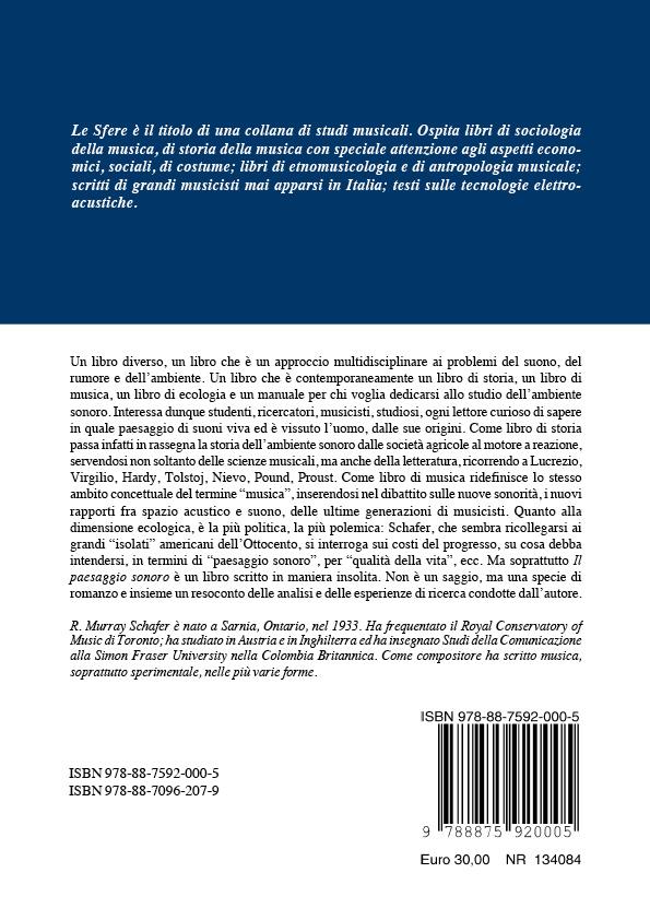 Un approccio multidisciplinare ai problemi del suono, del rumore e dell’ambiente. Un libro che è contemporaneamente un libro di storia, un libro di musica, un libro di ecologia e un manuale per chi voglia dedicarsi allo studio dell’ambiente sonoro. Interessa dunque studenti, ricercatori, musicisti, studiosi, ogni lettore curioso di sapere in quale paesaggio di suoni viva ed è vissuto l’uomo, dalle sue origini. Come libro di storia passa infatti in rassegna la storia dell’ambiente sonoro dalle società agricole al motore a reazione, servendosi non soltanto delle scienze musicali, ma della letteratura, ricorrendo a Lucrezio, Virgilio, Hardy, Tolstoj, Nievo, Pound, Proust. Comelibro di musica, ridefinisce lo stesso ambito concettuale del termine “musica”, inserendosi nel dibattito sulle nuove sonorità, i nuovi rapporti fra spazio acustico e suono, delle ultime generazioni di musicisti. Quanto alla dimensione ecologica, è la più politica, la più polemica: Schafer, che sembra ricollegarsi ai grandi “isolati” americani dell’Ottocento, si interroga sui costi del progresso, su cosa debba intendersi, in termini di “paesaggio sonoro”, per “qualità della vita”, ecc. Ma soprattutto Il paesaggio sonoro è un libro scritto in maniera insolita. Non è un saggio, ma una specie di romanzo e insieme un resoconto delle analisi e delle esperienze di ricerca condotte dall'autore. R. Murray Schafer è nato a Sarnia, Ontario, nel 1933. Ha frequentato il Royal Conservatory of Music di Toronto; ha studiato in Austria e in Inghilterra ed ha insegnato Studi della Comunicazione alla Simon Fraser University nella Colombia Britannica. Come compositore ha scritto musica, soprattutto sperimentale, nelle più varie forme.
