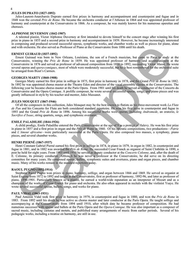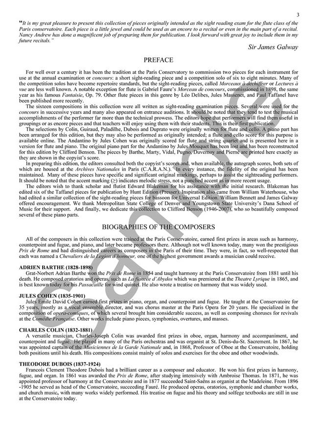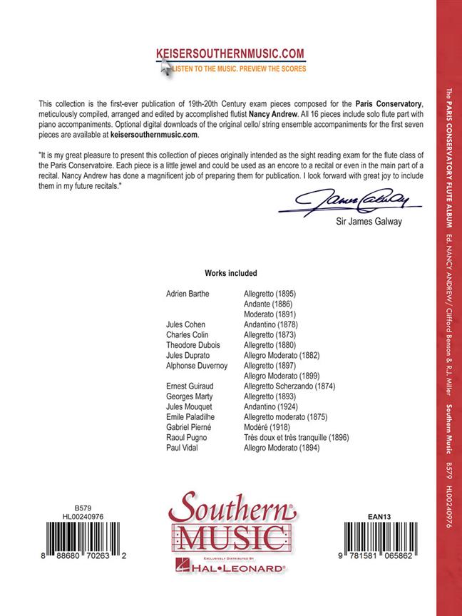 This collection is the first-ever publication of 19th-20th Century exam pieces composed for the Paris Conservatory, meticulously compiled, arranged and edited over the course of many years by accomplished flutist Nancy Andrews. All 16 pieces include solo flute part with piano accompaniments. Optional digital downloads are available as well of the original cello/string ensemble accompaniments where available. Sir James Galway's introduction to the album states: It is my great pleasure to present this collection of pieces originally intended as the sight reading exam for the flute class of the Paris conservatoire. Each piece is a little jewel and could be used as an encore to a recital or even in the main part of a recital. Nancy Andrew has done a magnificent job of preparing them for publication. I look forward with great joy to include them in my future recitals. Works included: Charles Colin 1873 Allegretto, Ernest Guiraud 1874 Allegretto Scherzando, Emile Paladilhe 1875 Allegretto Moderato, Jules Cohen 1878 Andantino, Theodore Dubois 1880 Allegretto, Jules Duprato 1882 Allegro Moderato, Adrien Barthe 1886 Andante, 1891 Moderato, 1895 Allegretto, Georges Marty 1893 Allegretto, Paul Vidal 1894 Allegro Moderato, Raoul Pugno 1896 Tres doux et tres tranquille, Alphonse Duvernoy 1897 Allegretto, Alphonse Duvernoy 1899 Allegro Moderato, Gabriel Pierne 1918 Modere, Jules Mouquet 1924 Andantino