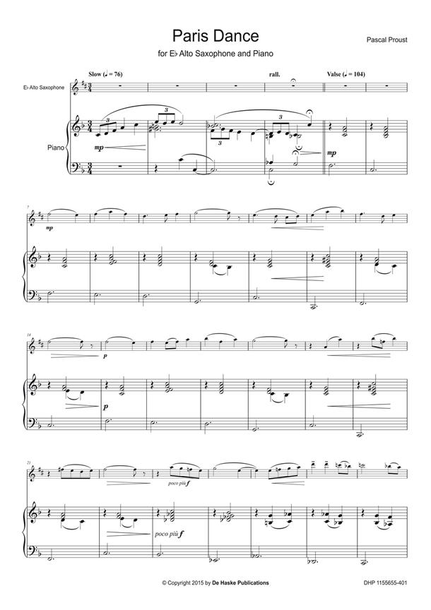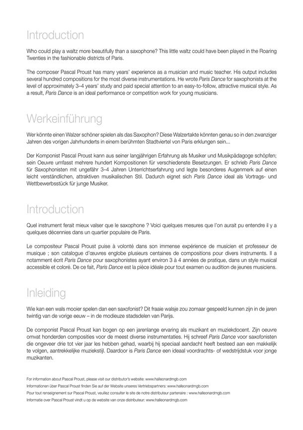 Le compositeur Pascal Proust puise à volonté dans son immense expérience de musicien et professeur de musique - son catalogue d'oeuvres englobe plusieurs centaines de compositions pour divers instruments. Il a notamment écrit Paris Dance pour saxophonistes ayant environ 3 à 4 années de pratique, dans un style musical accessible et coloré. De ce fait, Paris Dance est la pièce idéale pour tout examen ou audition de jeunes musiciens.