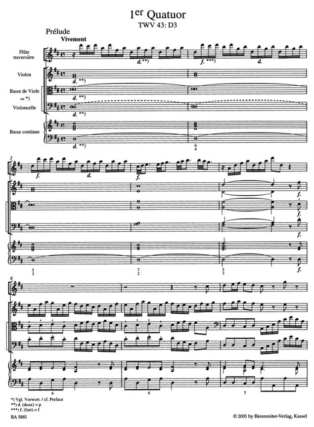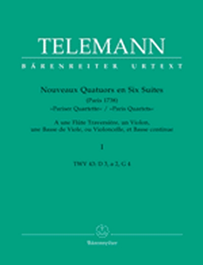 Nouveaux Quatuors en Six Suites I for Flute, Violin, Viola da Gamba or Violoncello and Basso Continuo ' Paris Quartets '. Volume 1: Quartets 1-3 (D major, A minor, G major) TWV 43: D3, a2, G4. Telemann ’s chamber music is historically unique in its range of instrumental settings. From his huge output these new editions present the six quartets for Flute, Violin, Viola da Gamba or Violoncello and Basso Continuo that he wrote in Paris in the 1730s. Published with the title Nouveaux Quatuors en Six Suites by Le Clerc in Paris in 1738, these six pieces are suites with various sequences of movements, each introduced by aprelude. Here Telemann shows himself committed to the French style. The works are of special interest not only for their high quality but also because of the variable scoring of the third part for Viola da Gamba or Violoncello. Our edition consists of a full score with preface (German/English) and separate instrumental parts including a Keyboard with figured bass.