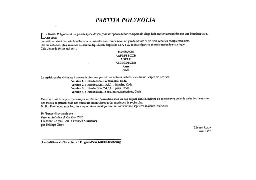 Partita Polyfolia Pour Saxophone Tenor ROLIN ETIENNE