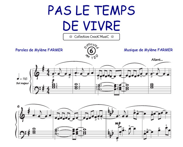 Pas le temps de vivre - Farmer, Mylène (Collection CrocK'MusiC) Arrangement Piano - 2 + feuillet pour paroles - niveau : Assez facile