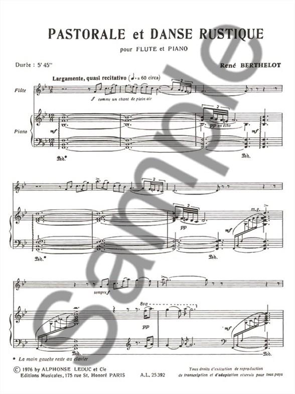 Cellist, conductor, composer and musicologist, Rene Berthelot (1903-1999) was influential in leading the Orleans Conservatory to obtain a high profile reputation. His Pastorale Et Danse Rustique for Flute and Piano contributes to a significant catalogue of compositions by the composer. Published in 1976, a typical performance of Pastorale Et Danse Rustique lasts around 5 minutes and 45 seconds. Characteristics include, complex rhythms, variation in time signatures and much contrast between the two movements. suitable for advanced flautists, Berthelot 's Pastorale Et Danse Rustique also provides alternative scorings for more difficult passages. For all advanced flautists, this Berthelot provides an exciting, alternative performance work.