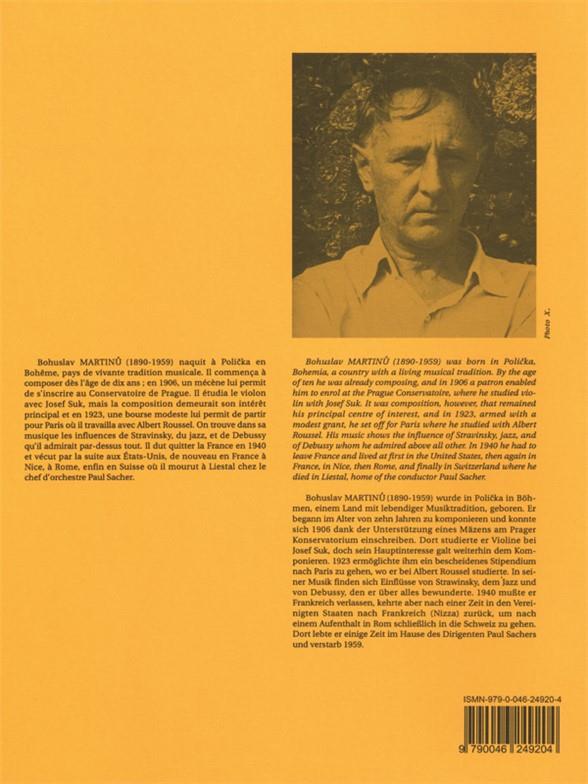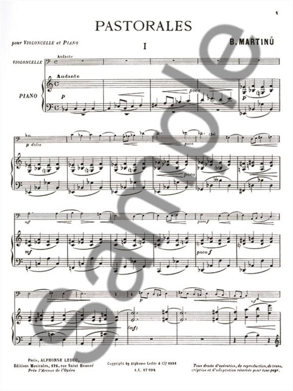 Bohuslav Martinu (1890-1959) was a prolific Czech composer, writing many large scale works. The composer moved to Paris in 1923 where he began experimenting in a variety of composition styles. Pastorales for Cello and Piano was published in 1931 and is made up of six pieces. Martinu himself was a violinist and the beginning of his experiments in composing for solo instruments saw him write for strings. Pastorales for Cello exemplifies the composer's influence of Stravinsky, Debussy neoclassicism, surrealism and jazz. The piece is excitingly virtuosic in its use of double stops, complexrhythms, chromaticism, and ensemble between the Cello and Piano. As a varied, substantial work for the Cello repertoire, Martinu 's Pastorales is essential for the advanced performer.