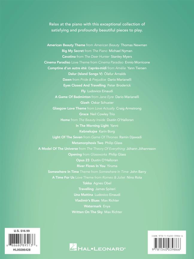 Détendez-vous au piano avec cette collection exceptionnelle de pièces satisfaisantes et profondément belles à jouer. Ces pièces ont été spécialement arrangées pour un piano facile, adaptées au pianiste de niveau 2 à 4 souhaitant se détendre avec cette section paisible.