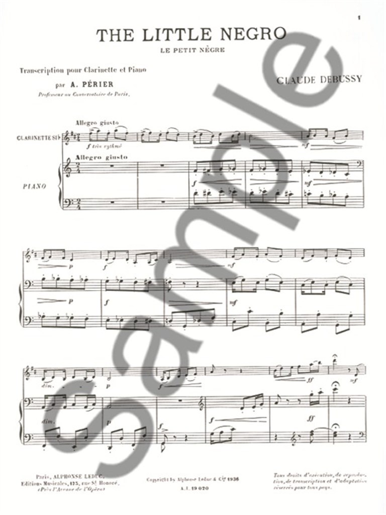 This version of the famous piece Le Petit Nègre by Claude Debussy is a version transcribed for Bb Clarinet and Piano by Auguste Perier, a professor at the Paris Conservatoire. First published in 1909, the piece, in C major, starts ; Allegro giusto and is an energetic cakewalk with an introduction followed by the main theme, which is repeated before the piece comes to a close. This really charming work would suit an upper-intermediate level or above and is perfect to start working on Debussy 's music.