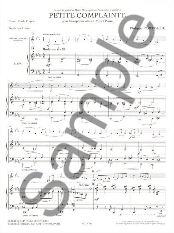 Contemporary French saxophonist, Philippe Portejoie studied at the Paris Conservatoire where he won many prizes. Composed in 2007, Petite Complainte for Alto Saxophone and Piano contributes to a significant collection of compositions by Portejoie. A typical performance of Petite Complainte lasts around three minutes and explores features, including a wide range, complex rhythms, chromaticism, ornamentation and variations in performance directions, amongst other aspects. For all aspiring, advanced saxophonists, Portejoie 's Petite Complainte is essentialto an exciting, varied repertoire.