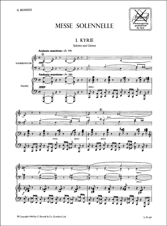 The complete Vocal Score for Gioacchino Rossini's Messe Solennelle with text in Latin.