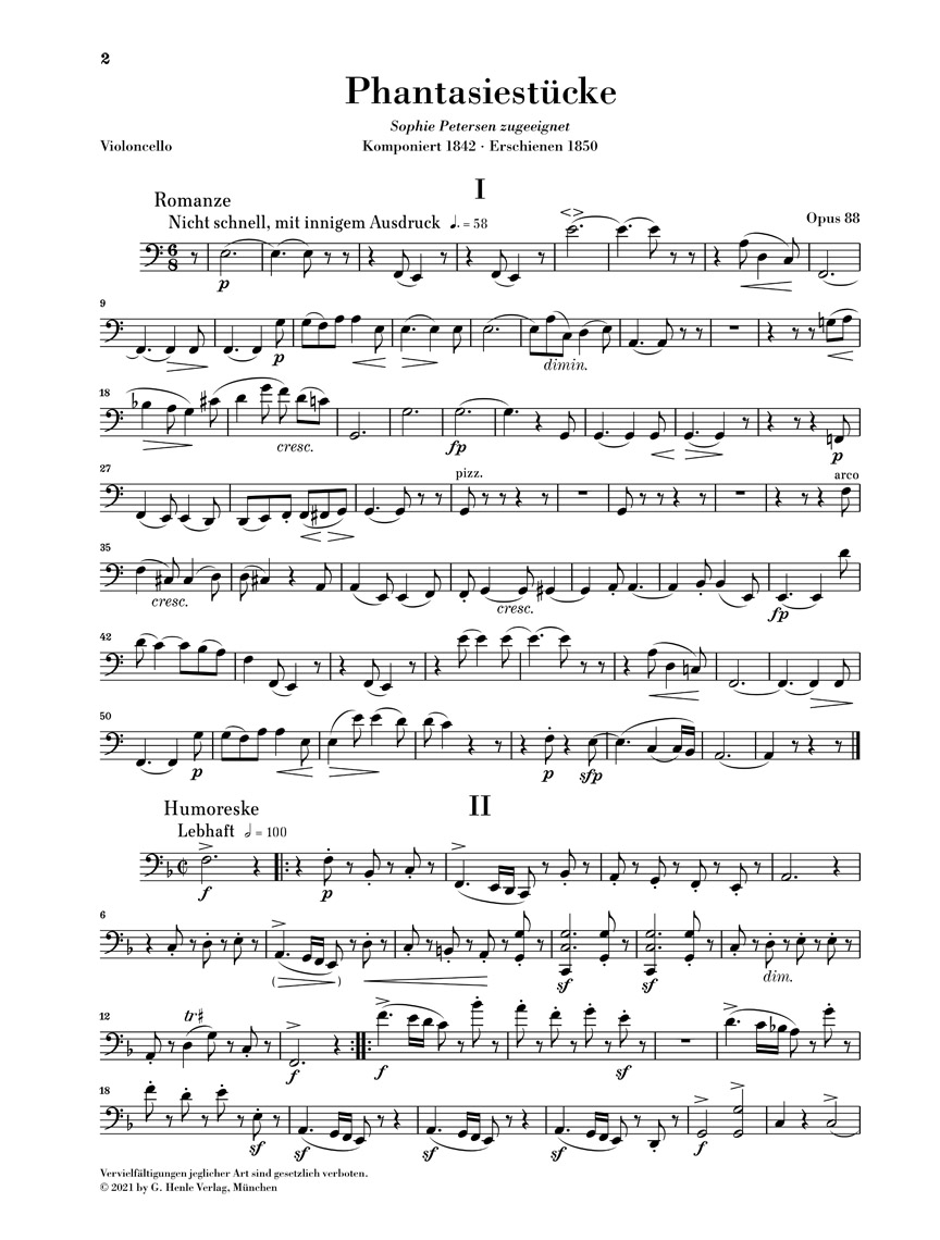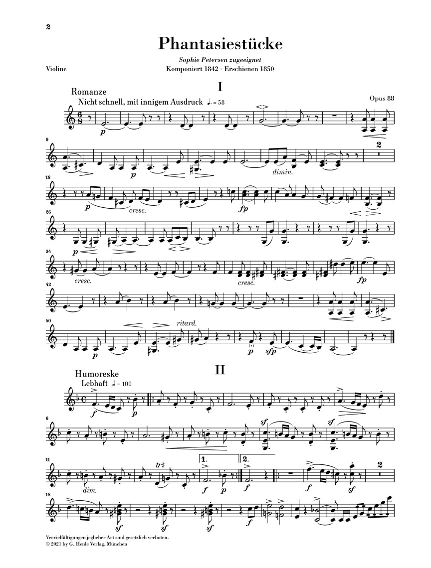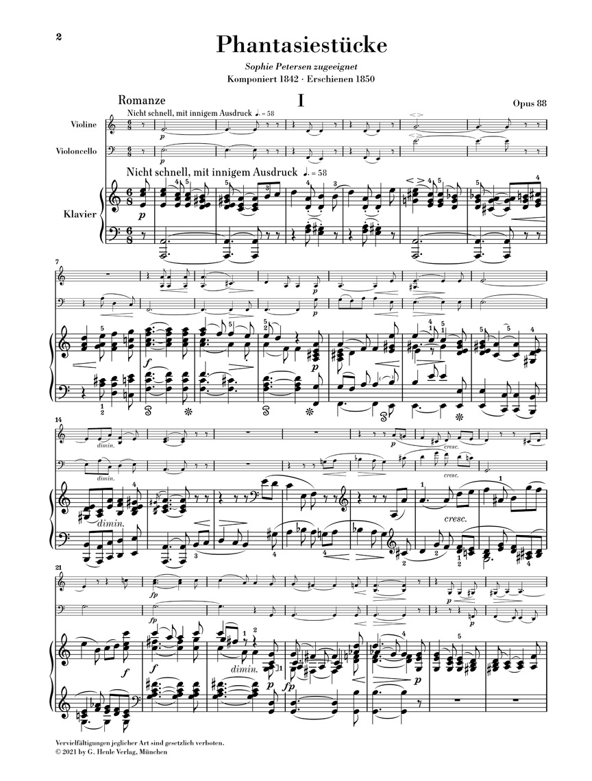 Les Phantasiestücke op. 88 forment la première contribution de Schumann au genre du trio avec piano et datent de 1842, sa très prolifique «année de la musique de chambre». Il aura cependant fallu un temps anormalement long à Schumann pour donner à l’œuvre sa forme définitive. Ce n’est qu’à l’automne 1850 que paraissent les Phantasiestücke après de multiples révisions. La concision et les modestes exigences techniques de ces quatre pièces de caractère, si enchanteresses, en font aussi pour les non-professionnels une introduction idéale à la musique de chambre de Schumann. Les Phantasiestücke, extraits du recueil intégral: Schumann · Trios avec piano HN 916 sont pour la première fois disponibles séparément chez Henle dans une édition pratique.
