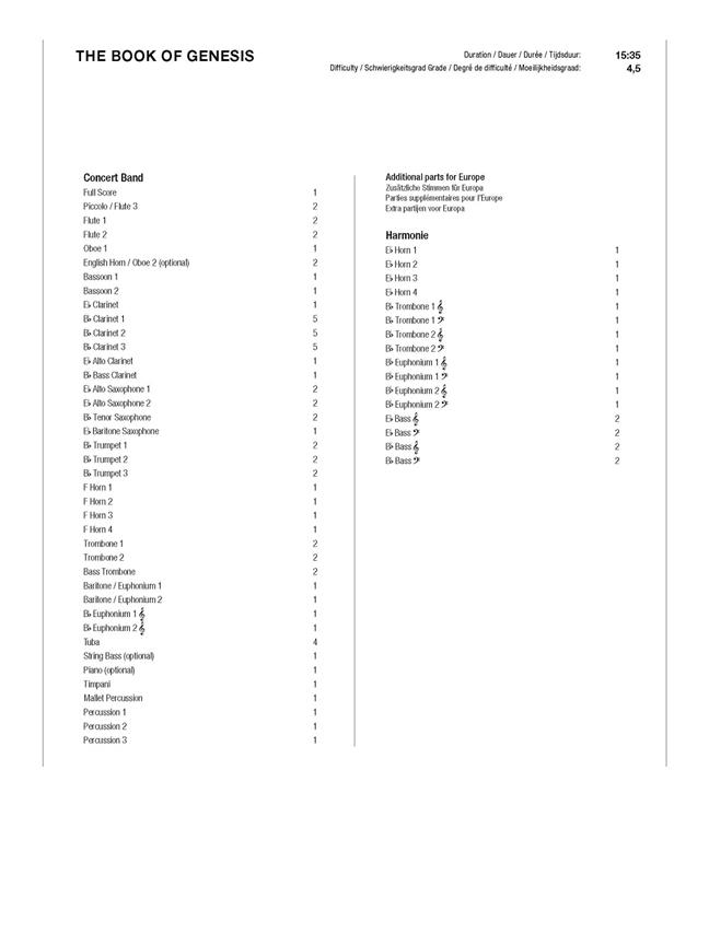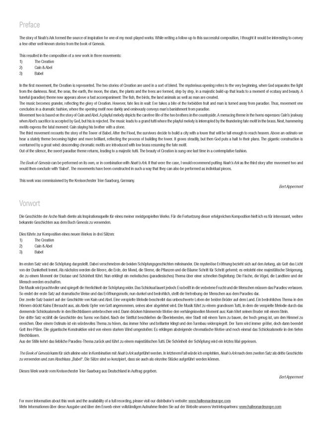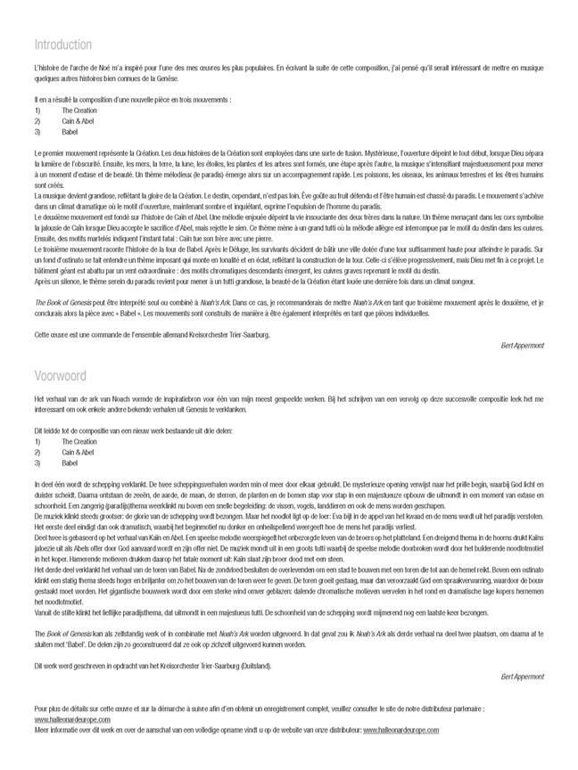 Noah’s Ark (1997) a recueilli un grand succès sur la scène internationale des orchestres d’harmonie, faisant de Bert Appermont une star dont la musique est maintenant interprétée et enregistrée dans le monde entier. Fasciné par les histoires et les sagas, il décida de combiner plusieurs histoires bibliques pour composer The book où Genesis, une oeuvre en trois mouvements «The Creation», «Cain & Abel» et «Babel». En concert où en concours, ces mouvements peuvent être interprétés soit individuellement, soit dans diverses combinaisons un choix très impressionnant qui se démarquera du reste.