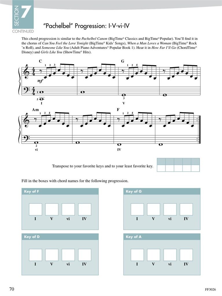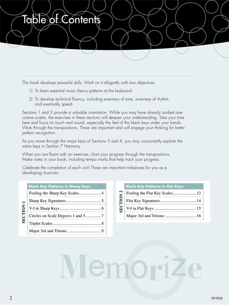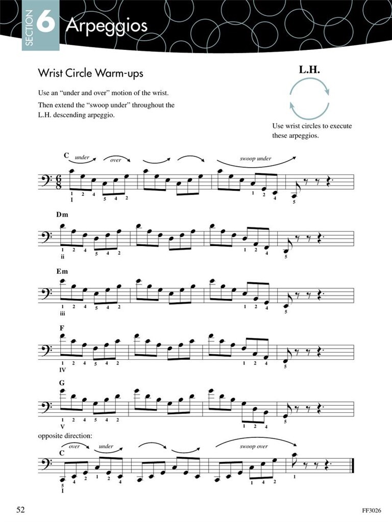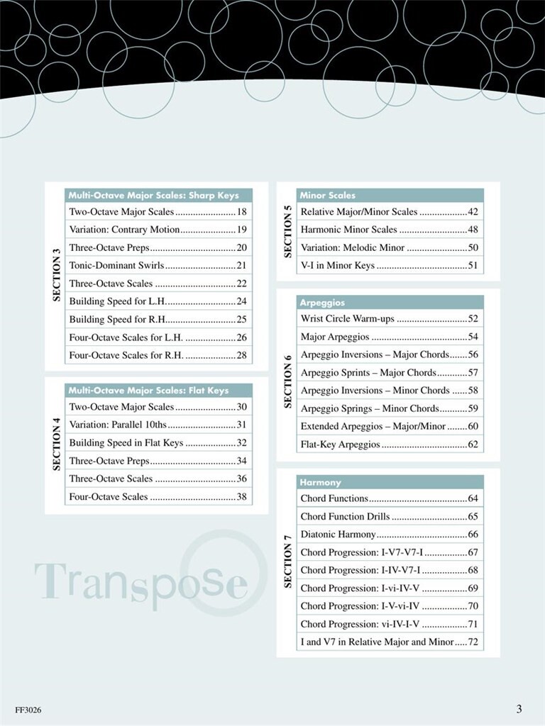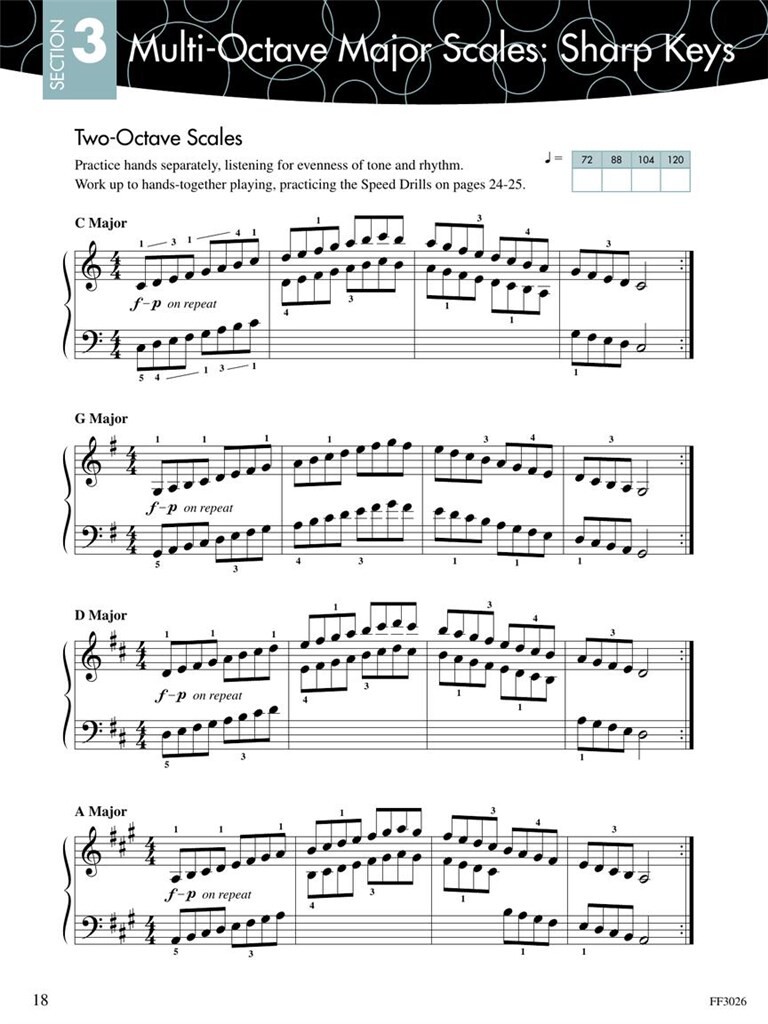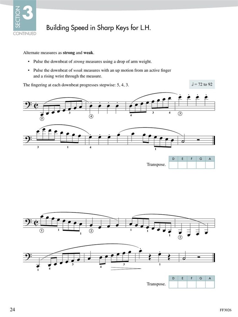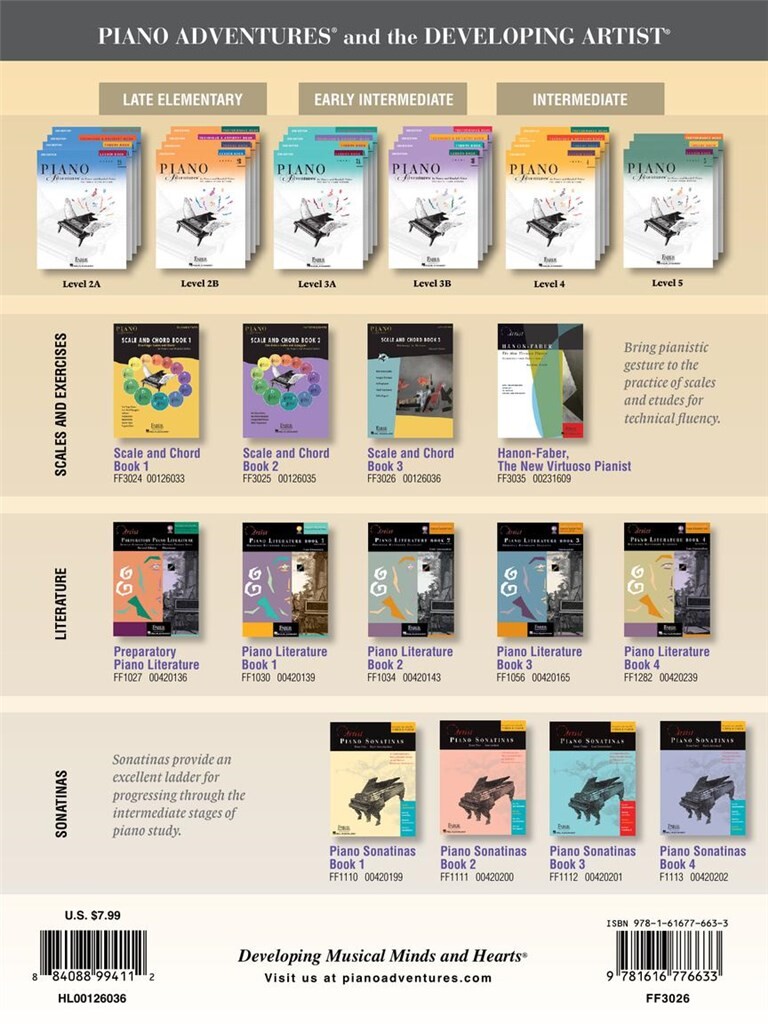 Les gammes et les arpèges sont la colonne vertébrale d’un jeu assuré et raffiné. Pratiquer ces deux piliers de la technique développe la dextérité et la vitesse. Combiné à des motifs essentiels de la théorie musicale, le résultat est une harmonie en mouvement. Ce n’est pas seulement une référence pour le progrès technique, Scale and Chord Book 3 encourage à se concentrer sur le toucher et le son, en particulier la sensation des touches noires sous les mains. Les élèves de la fin du niveau intermédiaire et avancé apprennent à interpréter avec aisance des escalades multi-octaves et des arpèges. Les exercices de transposition mettent l’accent sur la compréhension de la tonalité tonique, dominante et sensible. Les marques gestuelles dirigent l’intégration du mouvement du poignet. Et, surtout, l’étude des progressions d’accords fournit les outils nécessaires à l’analyse, à l’improvisation et à la composition. Regardez ici des vidéos d’introduction utiles