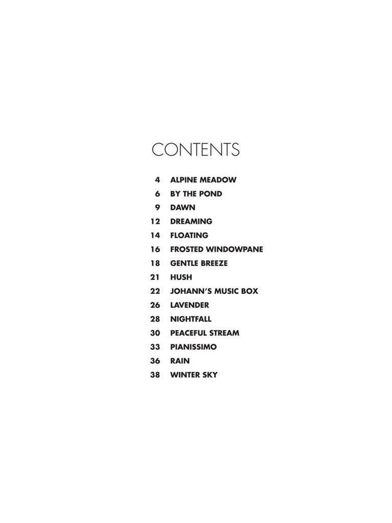 Piano Calm is an engaging collection of piano solos by Phillip Keveren intended to elevate both performer and listener into a meditative, peaceful state of mind. All the pieces are original compositions. Titles: Alpine Meadow · By the Pond · Dawn · Dreaming · Floating · Frosted Windowpane · Gentle Breeze · Hush · Johann's Music Box · Lavender · Nightfall · Peaceful Stream · Pianissimo · Rain · Winter Sky. A recording is also available via Burton Avenue Music.