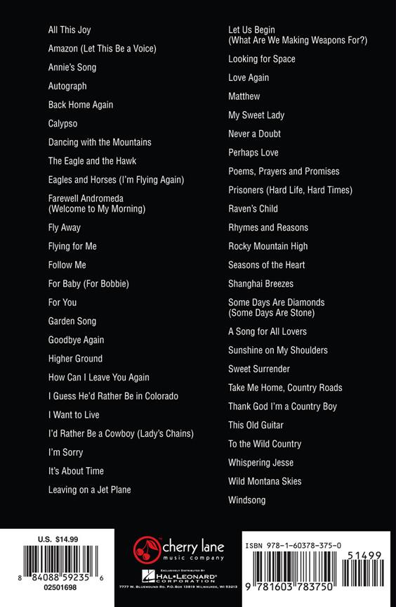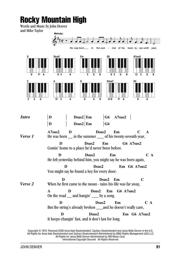 Lyrics, symboles d'accord et diagrammes d'accords de piano pour 50 des meilleurs de John Denver!