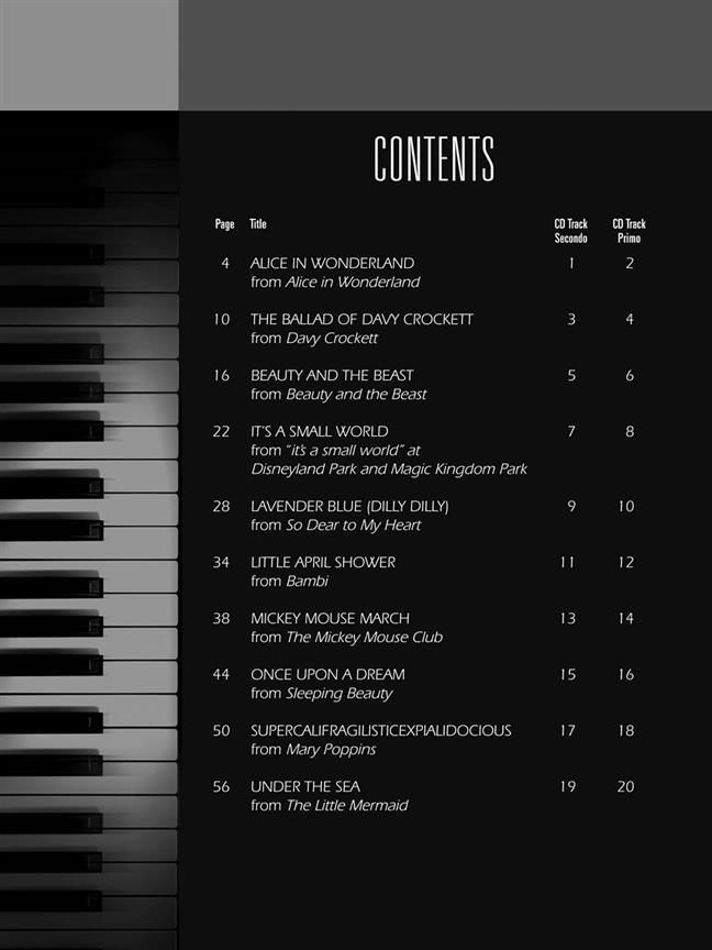 10 célèbres chansons des films de Disney pour piano 4 mains. Le CD contient les enregistrements du permier et second piano, ainsi vous pouvez travailler seul. Paroles anglaises