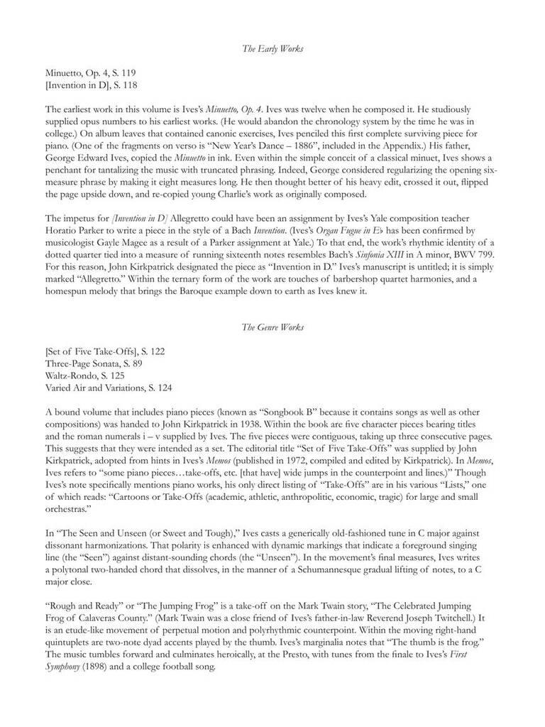 Volume 3 of The Complete Shorter Piano Works of Charles Ives is a compilation of miscellaneous works by Ives. These works range from small-scale early pieces to larger scale settings of music related to the Concord_x001A_Sonata. The volume also contains critical performance editions of four important genre pieces by Ives. Finally, the compendium includes the first publication of Ives's original piano version of The_x001A_St. Gaudens (Black March) and Three Places in New England. Two major works within this volume have a unique and complicated history.