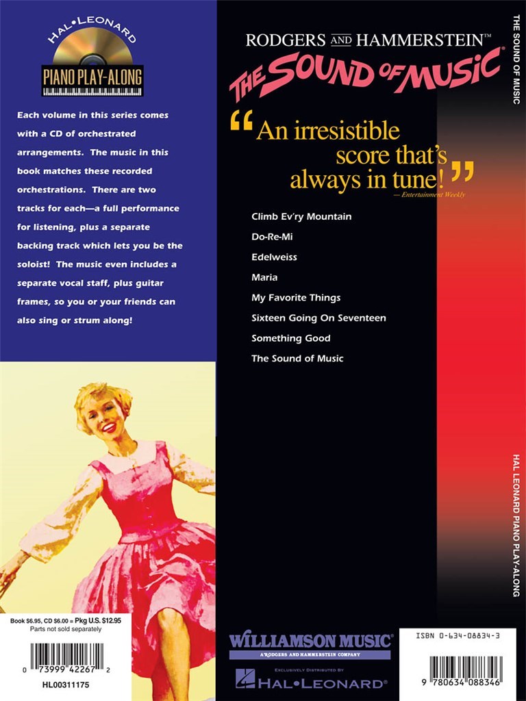 Paroles anglaises et arrangements pour piano de 'La mélodie du bonheur'. Un CD accompagnant le livre où se trouve 2 enregistrements pour chacune des chansons : une version complète et une version sans la partie piano pour vous permettre de jouer en groupe.