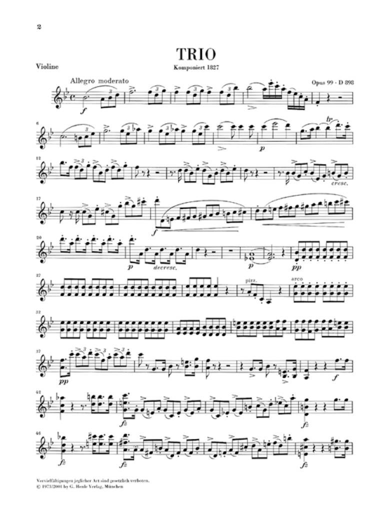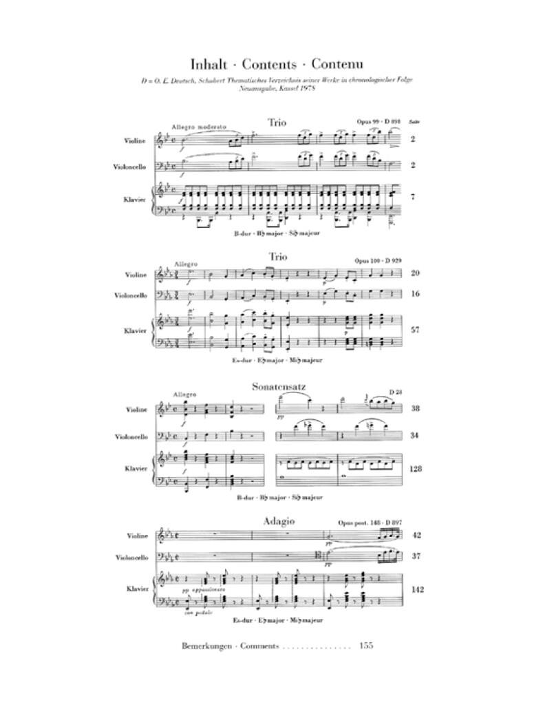 Les deux trios avec piano de Schubert peuvent indubitablement être comptés au nombre de ses oeuvres les meilleures. Composés tous les deux en 1827, c’est-à-dire un an avant sa mort, ce sont des oeuvres caractéristiques de sa maturité, riches d’une grande invention mélodique alliée à une forte puissance créatrice formelle et une profonde expressivité. Si le trio en Mi bé-mol majeur op. 100 D 929 fut vendu à l’éditeur de Leipzig Probst (il ne parut cependant que juste après la mort de Schubert), le trio en Si bémol majeur op. 99 D 898 ne fut pas imprimé du vivant du compositeur. L’adagio en Mi bémol majeur op. post. 148 D 897 reproduit en annexe et connu plus tard sous letitre de Notturno fut conçu à l’origine comme mouvement lent du trio en Si bémol majeur. Schubert pourrait l’avoir considéré comme impropre à la publication du fait de son caractère sombre et expressif jusqu’au désespoir. Il ne parut d’ailleurs qu’en 1846. En annexe de ce recueil figure également le premier essai dans le genre du trio composé par Schubert à l’été 1812, alors qu’il était âgé de 15 ans.
