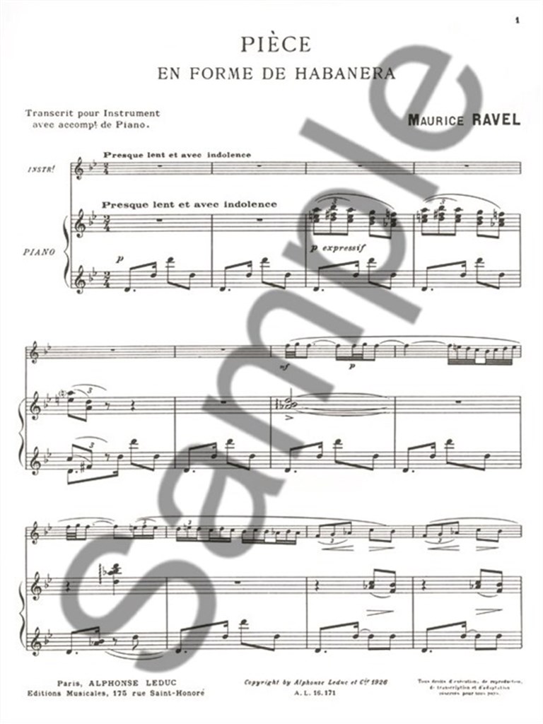 As a prestigious composer of the early 20th century, Maurice Ravel 's Pièce En Forme De Habanera, transcribed for Bassoon and Piano by Fernand Oubradous contains many features which continue to make the composer's music popular and loved to this day. Known for his masterful melodies and rich harmonies, Pièce En Forme De Habanera clearly exemplifies these qualities through flourishing Bassoon lines and evocative, chordal and rhythmic Piano accompaniments. Moreover, Habanera rhythms heard throughout the piece create further excitment. All of these musical elementscombined create a highly enjoyable piece for the Bassoon and Piano repertoire. In addition, the clear print of separate solo and accompaniment parts in this edition of Pièce En Forme De Habanera add to an irresistible purchase for aspiring Bassoon players.