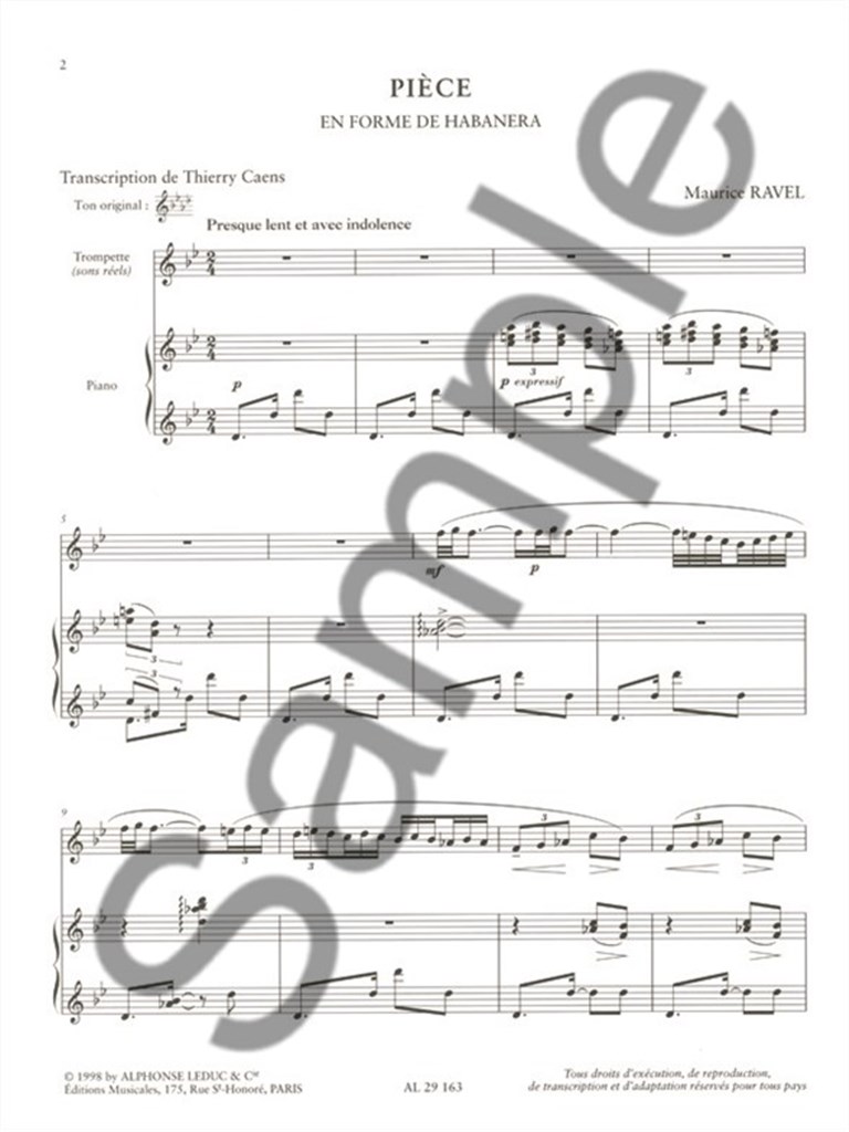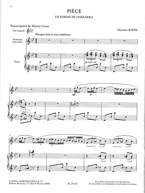 Initially composed in 1907 for Bass Voice and Piano, Habanera by Maurice Ravel was transcribed for Trumpet and Piano for this edition. Based on a Cuban Contradanza, it features a special Habanera rhythm and is generally performed with sung lyrics. In this edition, the Trumpet is a substitute for the Voice. While composing this piece, Maurice Ravel was also working on two works with Spanish influence: The Spanish Rhapsody and The Spanish Hour. Maurice Ravel (1875-1937) was a French composer, who is most famous for his Impressionist compositions. He wrote numerous pieces, including Daphnisand Chloe and the famous Bolero.