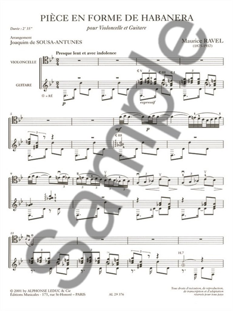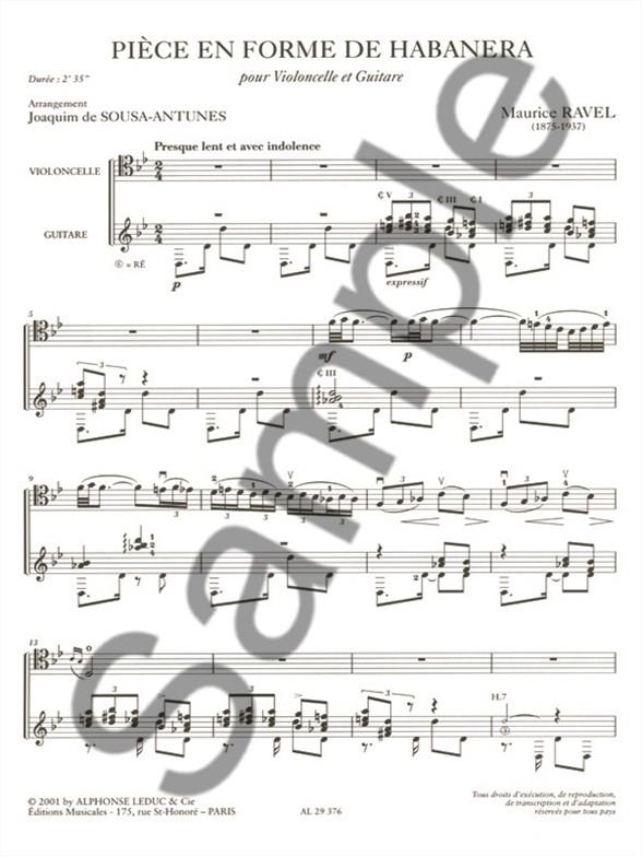 As a prestigious composer of the early 20th century, Maurice Ravel 's Piece in the Habanera Style, transcribed for Cello and Guitar by Joaquim de Sousa-Antunes contains many features which continue to make the composer's music popular and loved to this day. Known for his masterful melodies and rich harmonies, Piece in the Habanera Style clearly exemplifies these qualities through flourishing Cello lines and evocative, chordal and rhythmic Guitar accompaniments. Moreover, Habanera rhythms heard throughout the piece create further excitment. All of these musical elements combine to create a highly enjoyable piece for the Cello and Guitar repertoire. In addition, the clearprint of separate solo and accompaniment parts in this edition of Piece in the Habanera Style add to an irresistible purchase for aspiring Cello players.