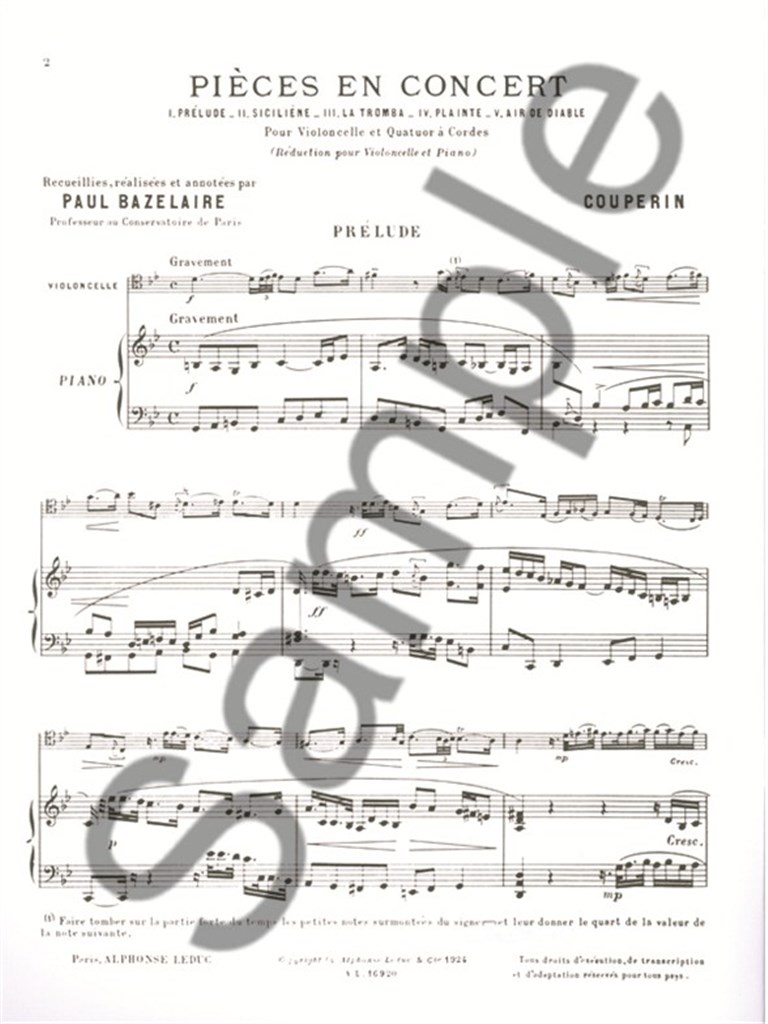 Initialement écrit par Couperin, ce recueil de pièces de concert a été critiqué et commenté par Paul Bazelaire, professeur au Conservatoire de Paris. Cette version pour violoncelle et piano, écrite pour des joueurs intermédiaires ou intermédiaires supérieurs, comprend 5 pièces : - Prélude - Sicilienne - La Tromba - Plainte - Air de Diable Écrites en difficulté croissante, ces pièces existent également en version pour violoncelle et quatuor à cordes. François Couperin est un compositeur français très célèbre qui jouait du clavecin et de l’orgue. Issu d’une famille célèbre de musiciens, il fut surnommé « Couperin le Grand ».