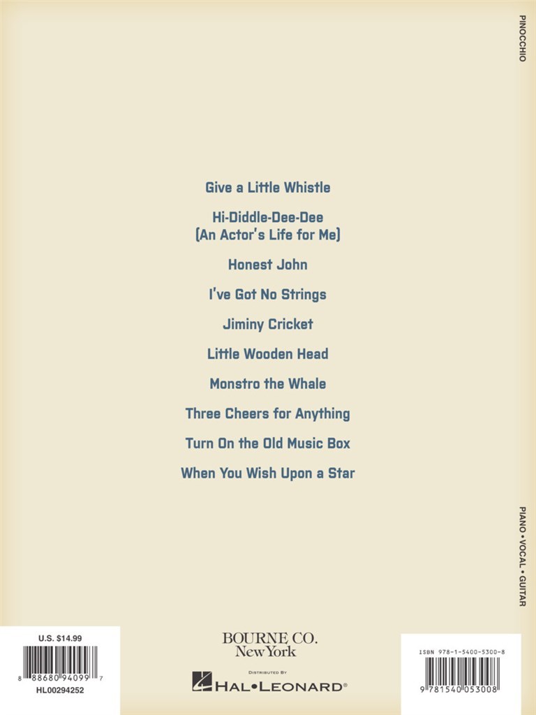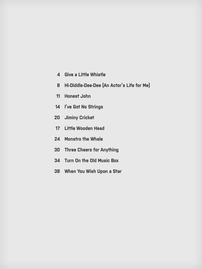 Ten selections from the 1940 Walt Disney film which was presented in Multiplane Technicolor in arrangements for piano, voice and guitar. Songs: Give a Little Whistle - Hi-Diddle-Dee-Dee (An Actor's Life for Me) - Honest John - I've Got No Strings - Jiminy Cricket - Little Wooden Head - Monstro the Whale - Three Cheers for Anything - Turn on the Old Music Box - When You Wish upon a Star. Ten selections from the 1940 Walt Disney film which was presented in Multiplane Technicolor in arrangements for piano, voice and guitar. Songs: Give a Little Whistle - Hi-Diddle-Dee-Dee (An Actor's Life for Me) - Honest John - I've Got No Strings - Jiminy Cricket - Little Wooden Head - Monstro the Whale - Three Cheers for Anything - Turn on the Old Music Box - When You Wish upon a Star.