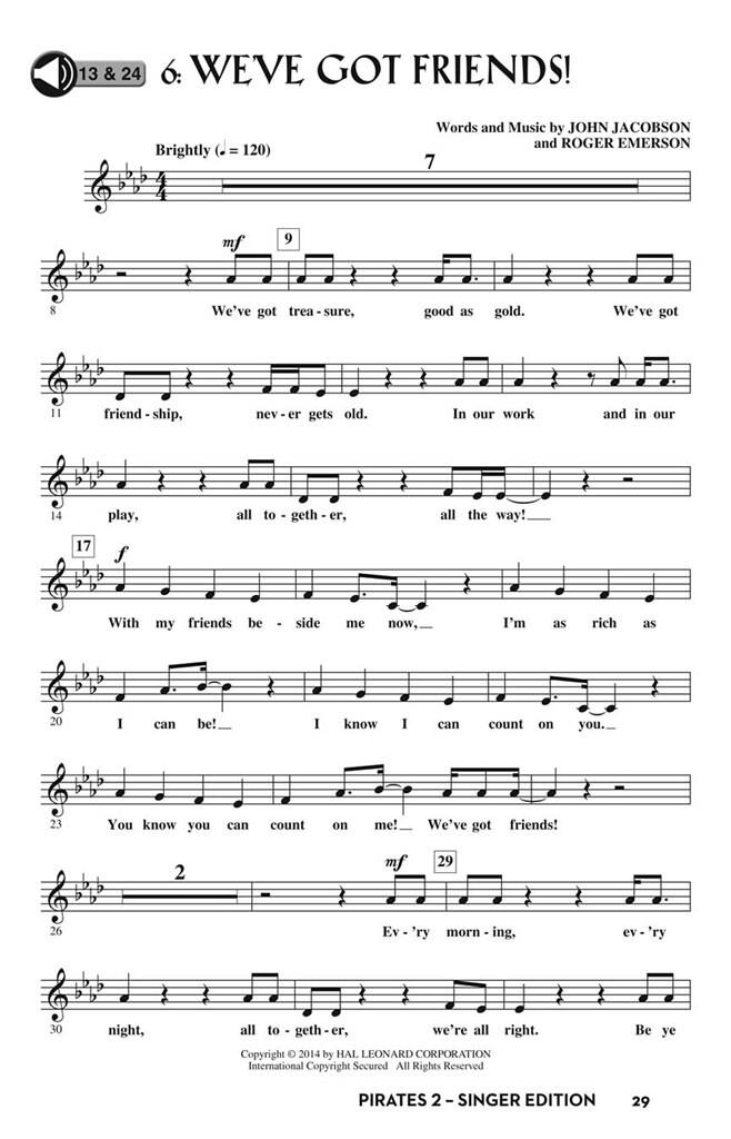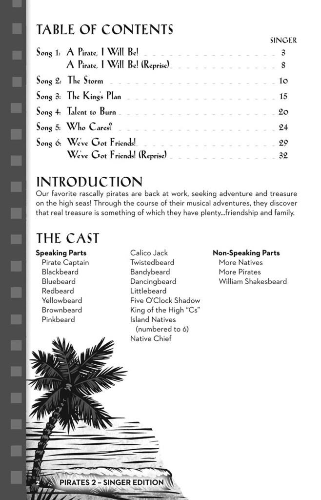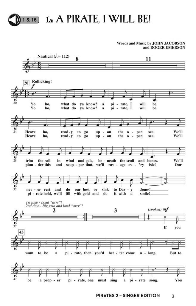Du Capitaine John Jacobson et de Jolly Roger Emerson – ARRRR ! Nos pirates préférés sont de retour, en quête d'aventure et de trésors en haute mer ! Mais une terrible tempête se lève et les pirates se retrouvent naufragés sur une île déserte… ou du moins le croient-ils ? Le Roi des Do aigus aura-t-il un plan pour les sauver ? Au fil de leurs aventures musicales, ils découvrent que le vrai trésor, c'est ce qu'ils possèdent en abondance : l'amitié et la famille. Conçue pour les élèves du CM1 et du collège, cette comédie musicale de 35 minutes propose six chansons originales, un livret et plus de 20 rôles parlés. Le guide pédagogique regorge de ressources de qualité, notamment des arrangements piano/voix, des chorégraphies, le livret, un guide de production et des objectifs pédagogiques conformes aux programmes scolaires pour chaque chanson. Pour aller plus loin, les livres élèves, prêts à l'emploi, incluent les chansons et le livret et enrichiront l'expérience musicale de vos jeunes acteurs/chanteurs en herbe ! Les chansons incluent : A Pirate I Will Be, The Storm, The King's Plan, Talent to Burn, Who Cares, We've Got Friends! 35 minutes.