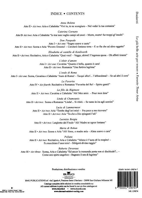 Un volume récemment publié où adorait des arias d’Anna Bolena, Caterina Coranos Doù Pasquale, Elisabetta al castello di Kenilworth, L’elisir d’amore, L’esule di Roma, La Favorita, La fille du Régiment, Linda di Chamounix, Lucia di Lammermoor, Lucrezia Borgia, Maria di Rohan, Poliutoù et Roberto Deveroux. Textes italiens avec traductions anglaises et notes supplémentaires.