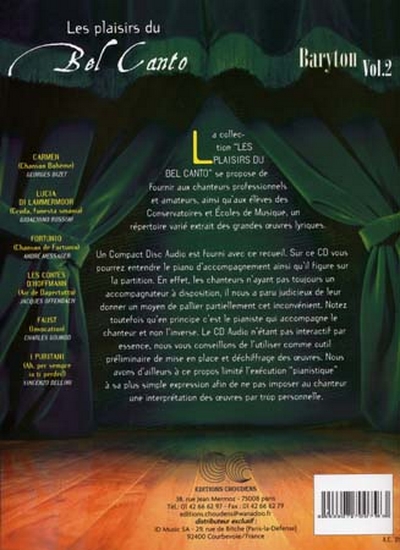 La collection 'Les Plaisirs du Bel Canto' se propose de fournir aux chanteurs professionnel et amateurs, ainsi qu'aux élèves des Conservatoires et Ecoles de Musique, un répertoire varié extrait des grandes oeuvres lyriques. Les paroles sont en français. Un Compact Disc Audio est fourni avec ce recueil où se trouve l'accompagnement piano.