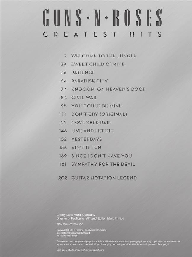 Ce volume comprend les favoris Knockin' on Heaven’s Door, Live and Let Die, Paradise City, Sweet Child O' Mine et bien d’autres.
