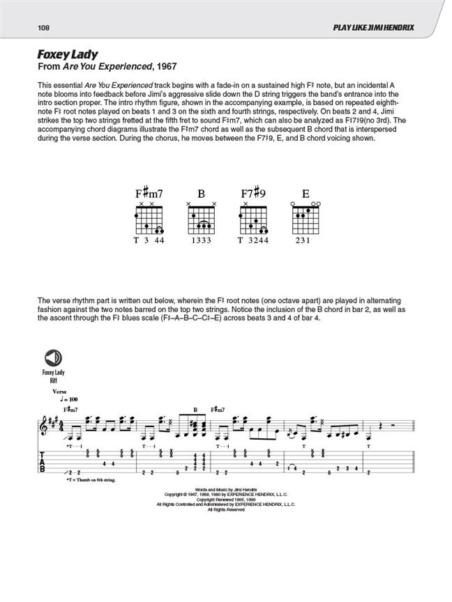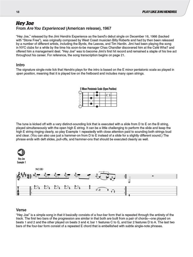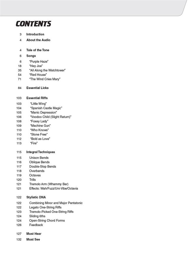 Study the trademark songs, licks, tones and techniques of the ultimate Guitar god, Jimi Hendrix . This comprehensive book and audio teaching method provides detailed analysis of Hendrix s gear, tone, techniques, styles, songs, licks, riffs and much more. Includes a unique code that will give you access to audio files of all the music in the book online. Songs include: All Along the Watchtower, Bold As Love, Foxey Lady, Hey Joe, Purple Haze, Voodoo Child (Slight Return), The Wind Cries Mary and more.
